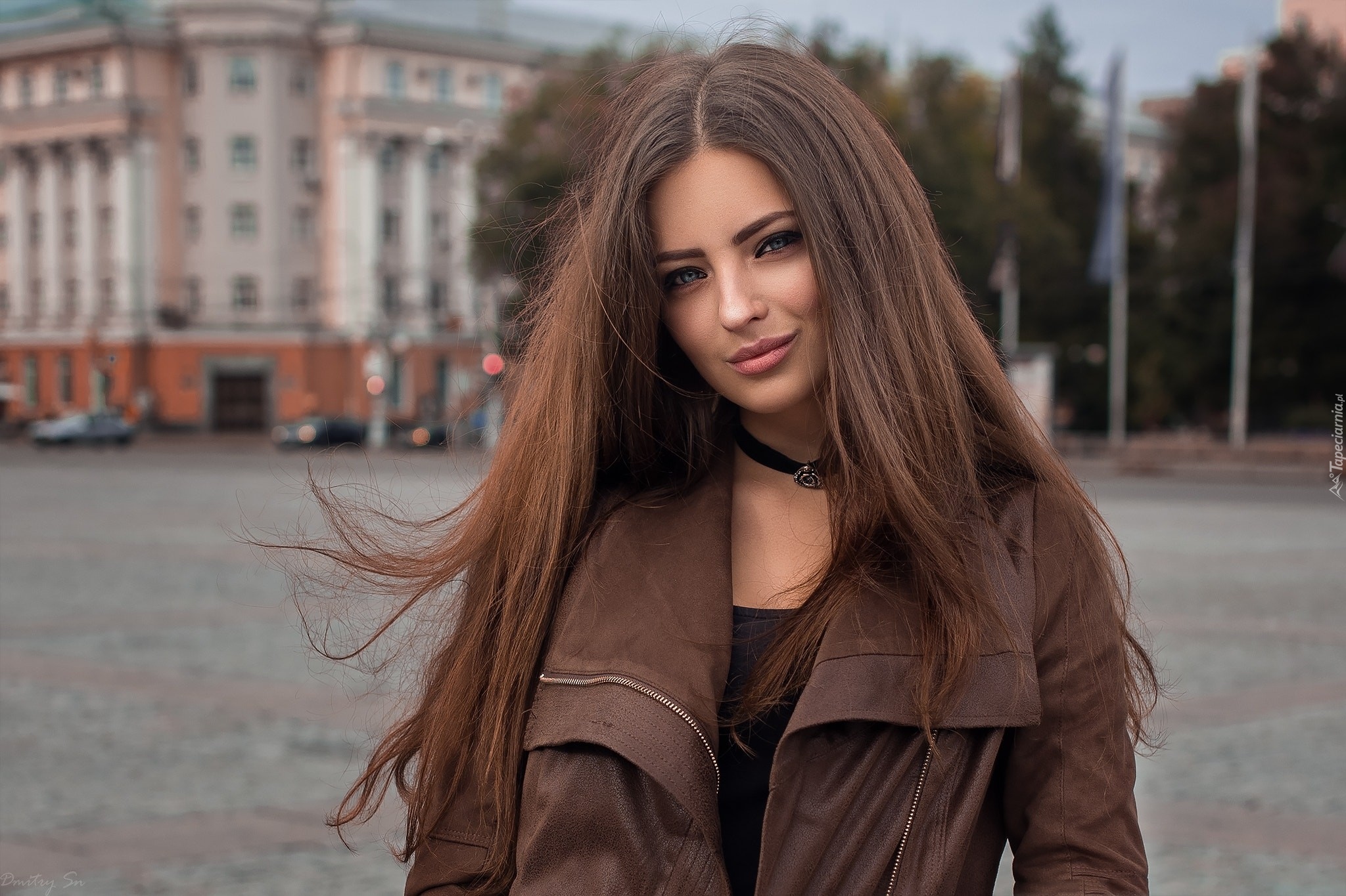Edytor tapety: Uśmiechnięta szatynka na ulicy