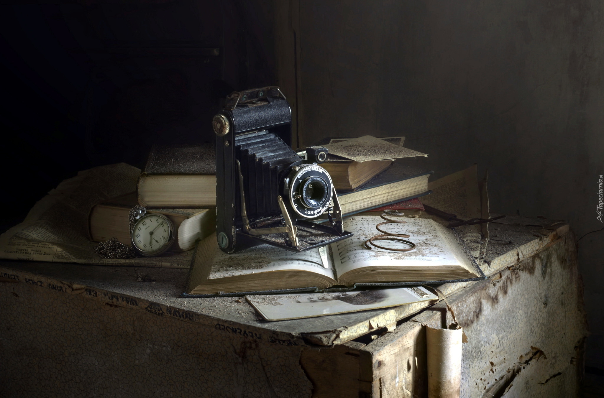 Edytor tapety: Stary aparat i książki leżą na skrzyni