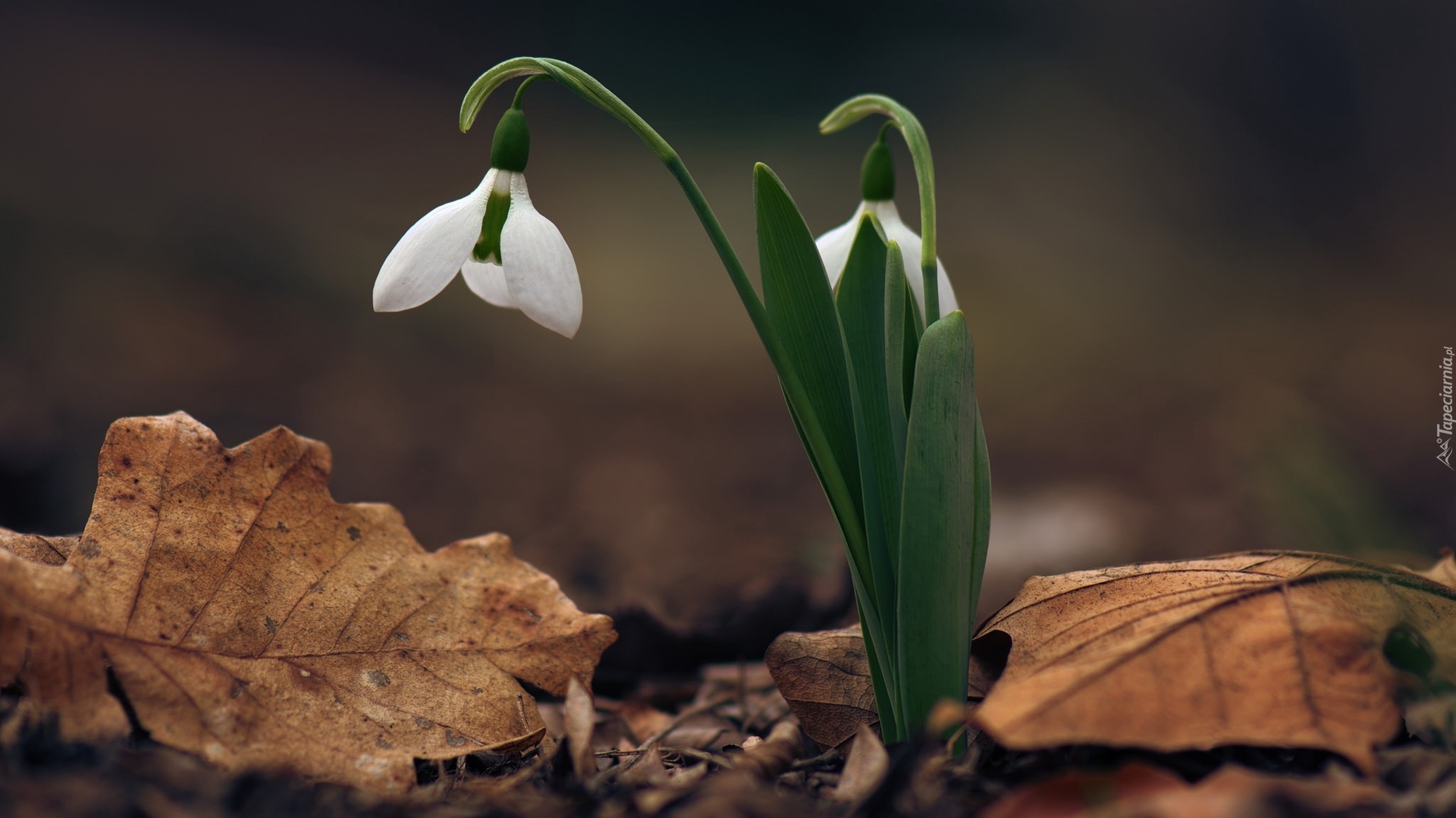 Edytor tapety: Białe przebiśniegi wśród suchych liści