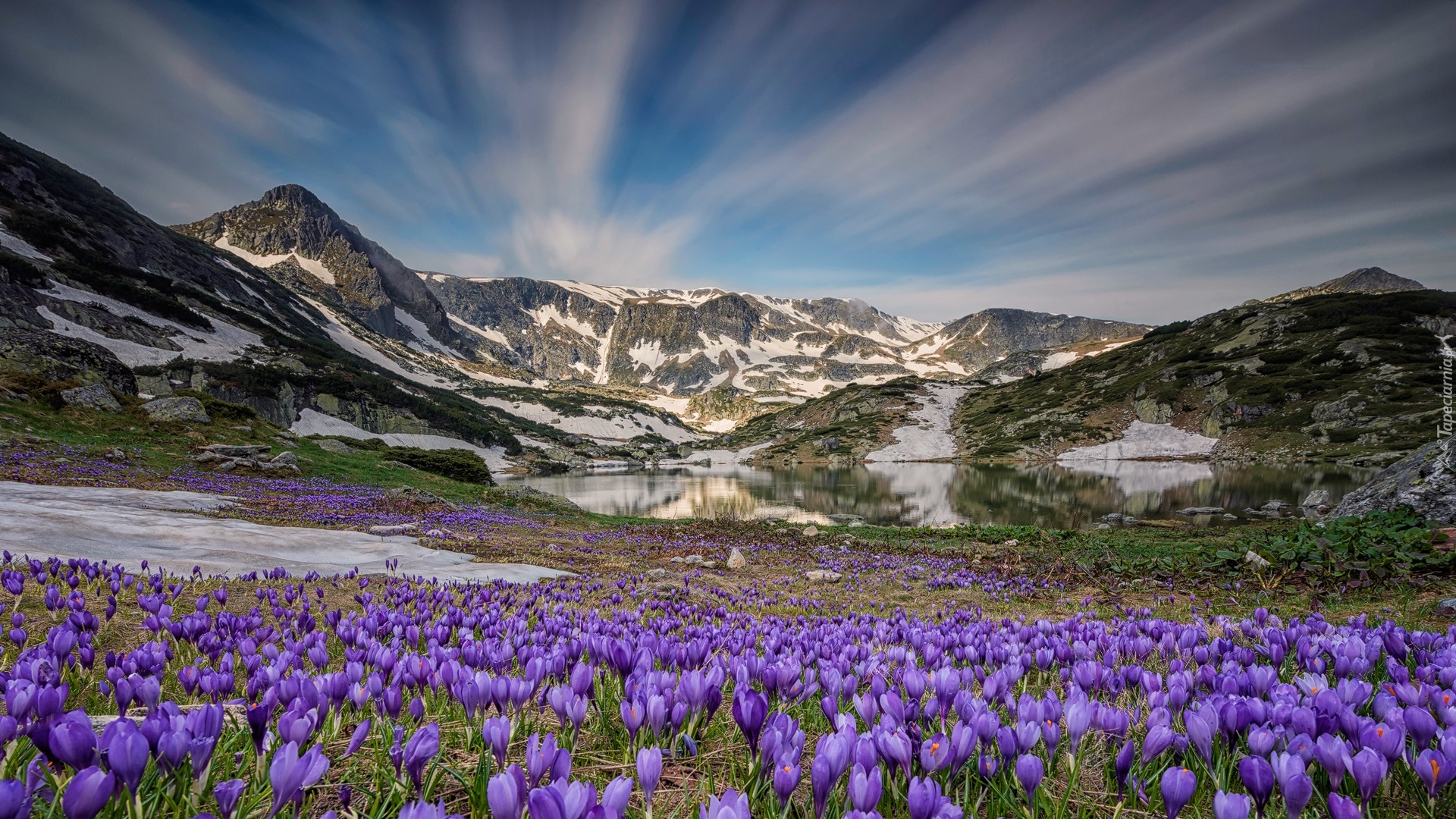 Edytor tapety: Fioletowe krokusy nad górskim jeziorem
