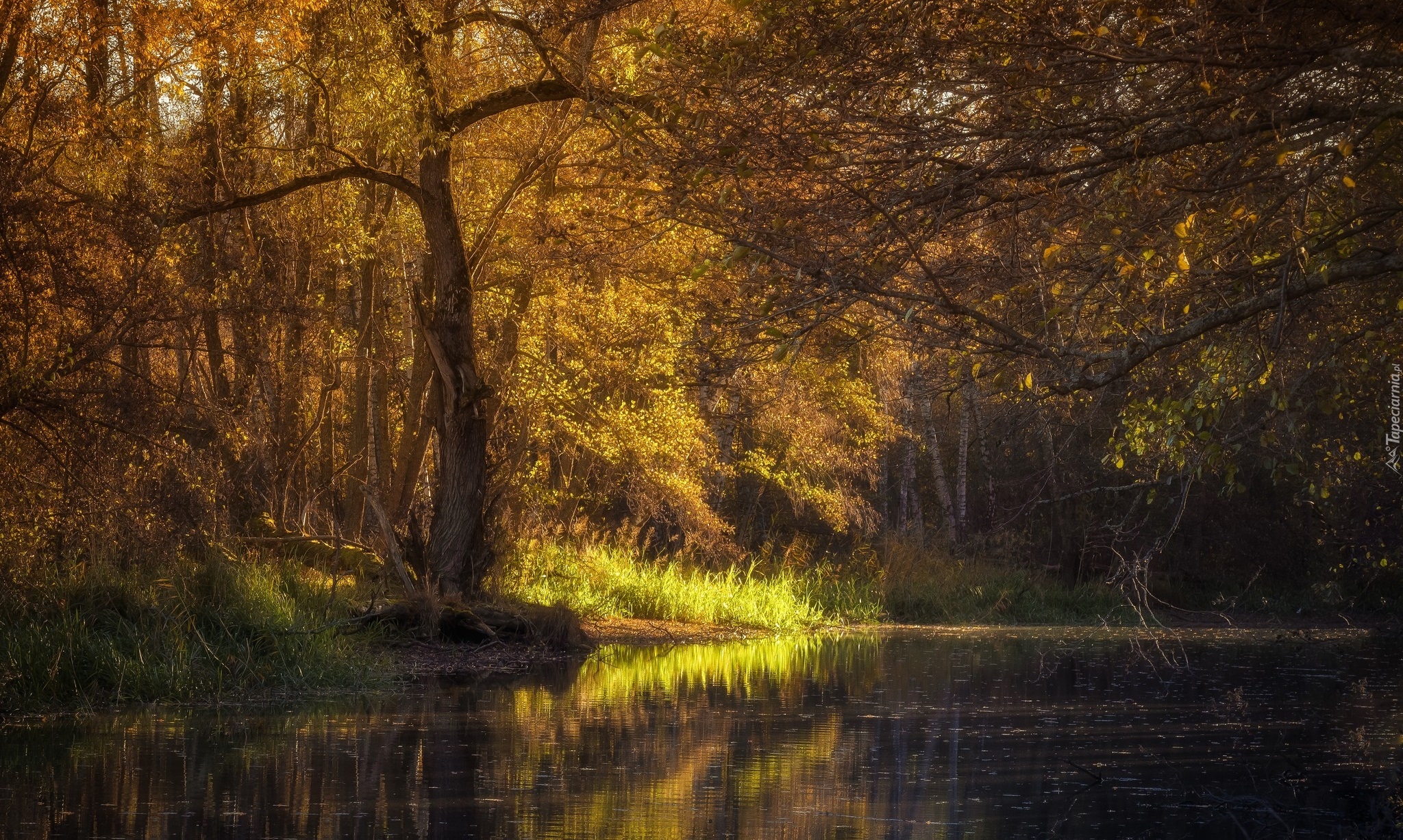 Edytor tapety: Rzeka płynącą wzdłuż jesiennego lasu