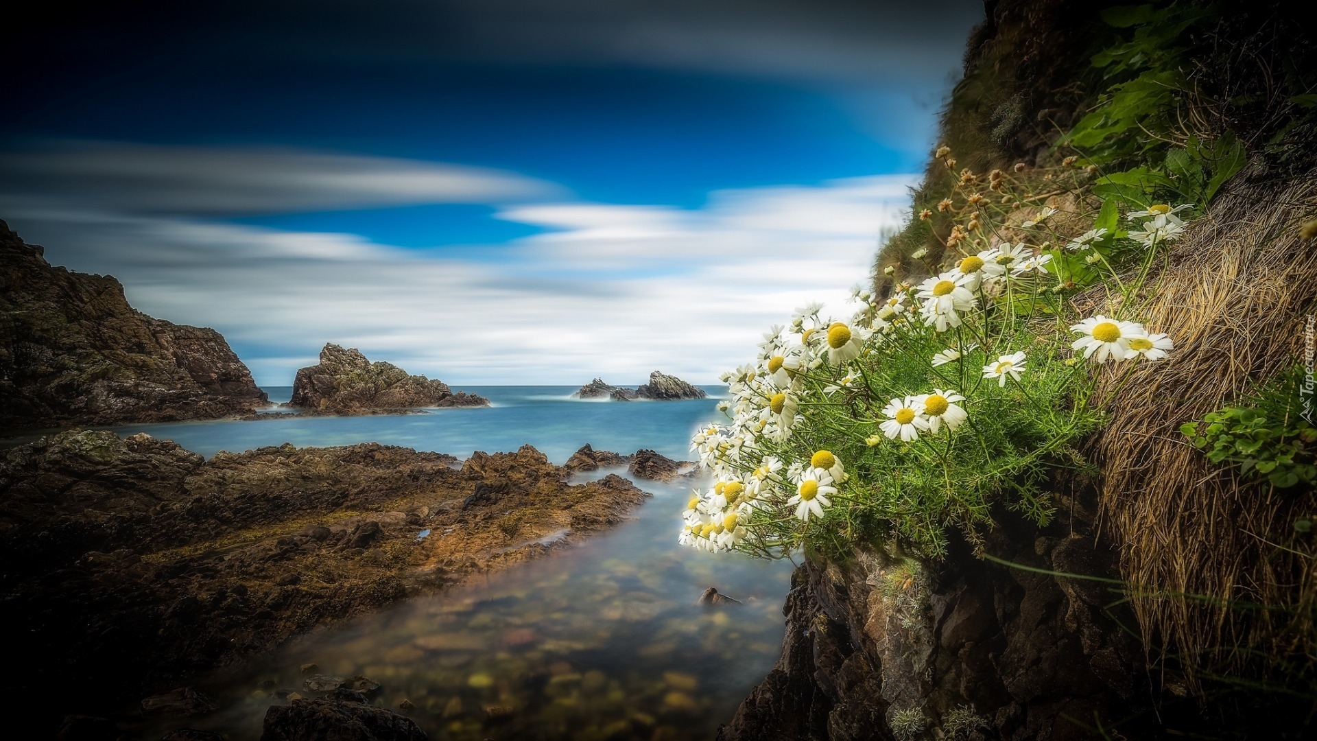 Edytor tapety: Kwiaty rumianku na skale u wybrzeży Szkocji