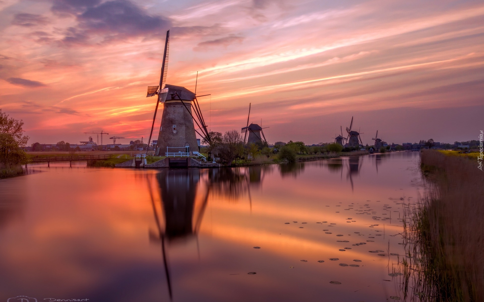 Edytor tapety: Wiatraki nad rzeką w Holandii o zachodzie słońca