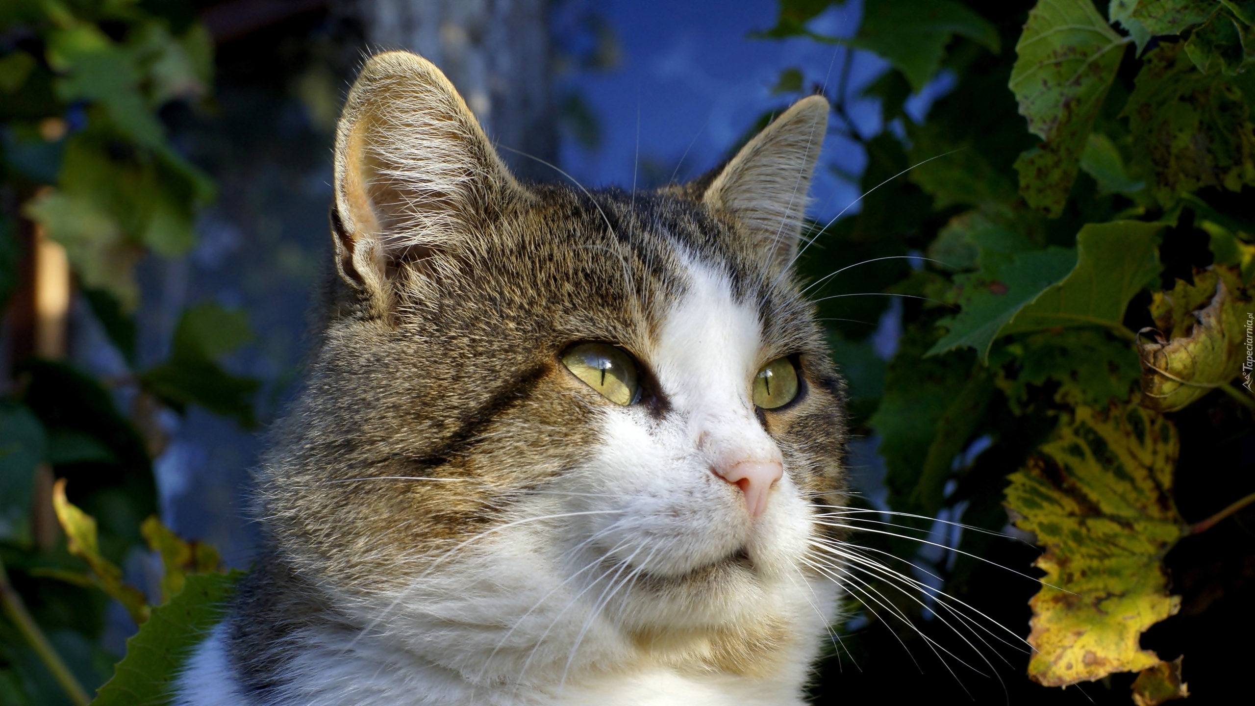 Edytor tapety: Zamyślony kotek obok zielonych listków
