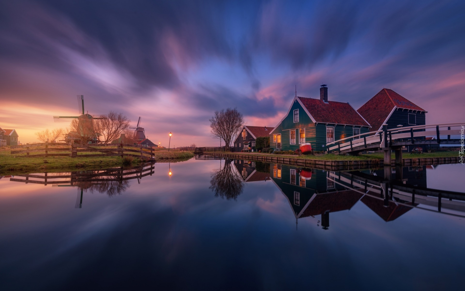 Edytor tapety: Skansen Zaanse Schans w Zaandam o zmierzchu