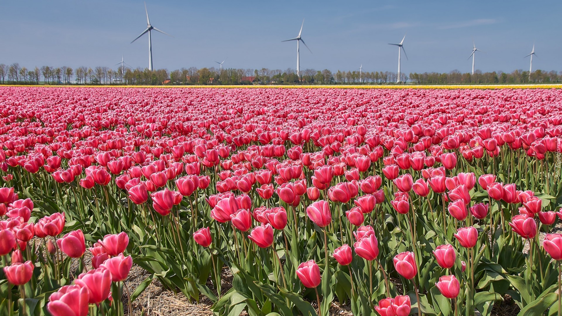 Edytor tapety: Pole czerwonych tulipanów z wiatrakami w tle