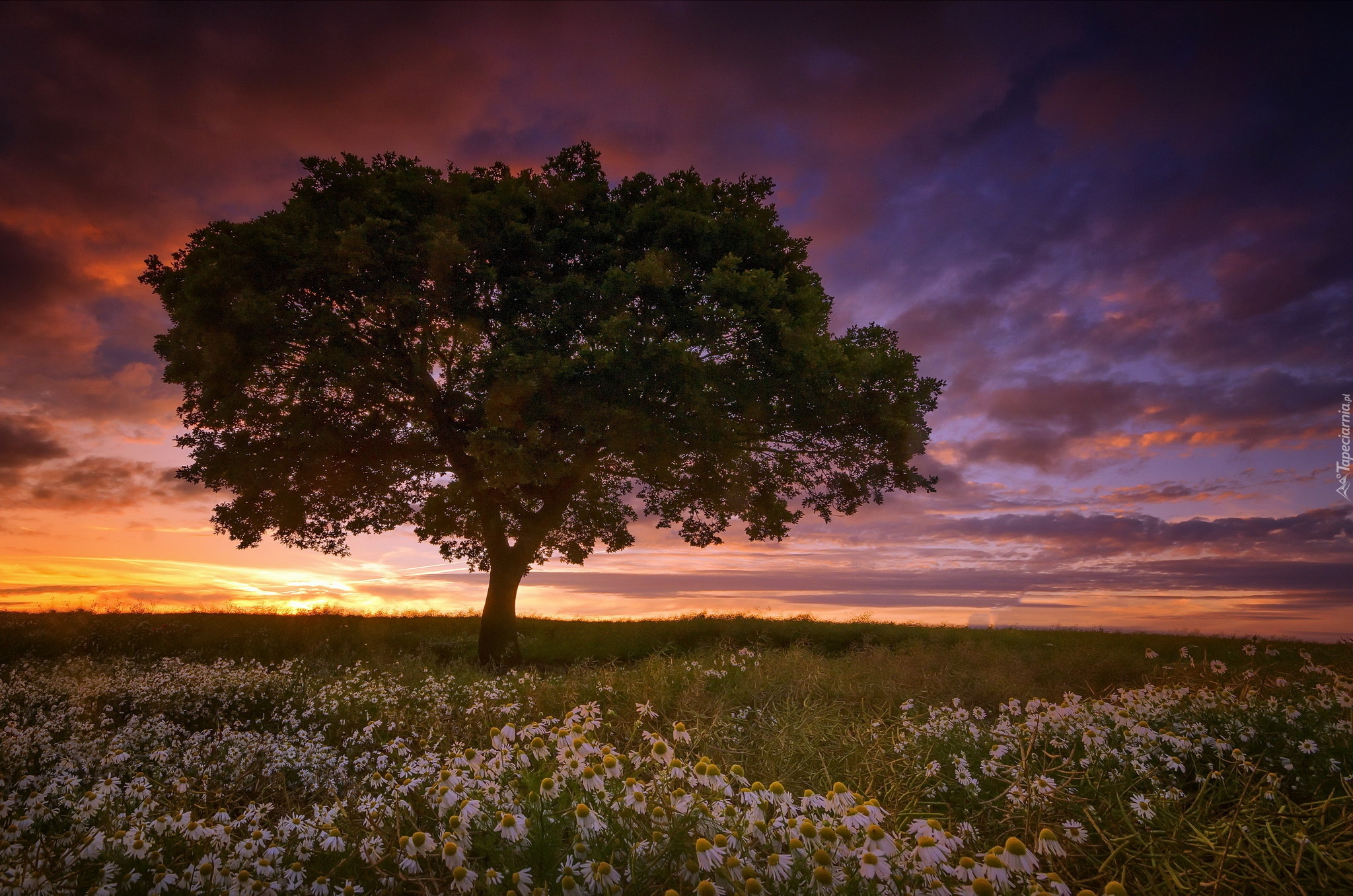 Edytor tapety: Drzewo na łące w zachodzącym słońcu