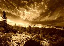 Edytor tapety: Skały porośnięte drzewami z górami w tle o zachodzie słońca