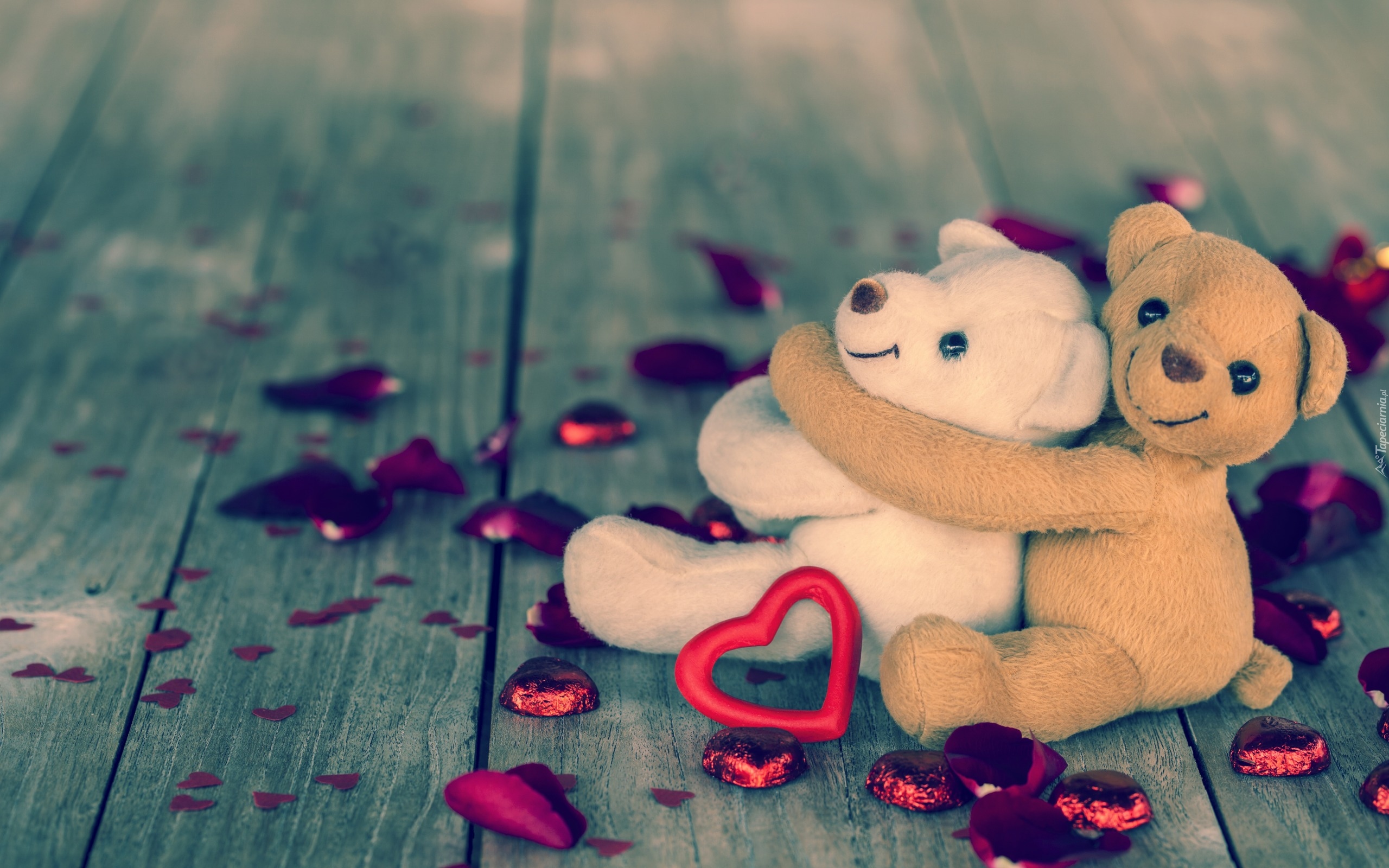Edytor tapety: Pluszowe misie w czułym uścisku obok rozrzuconych serduszek