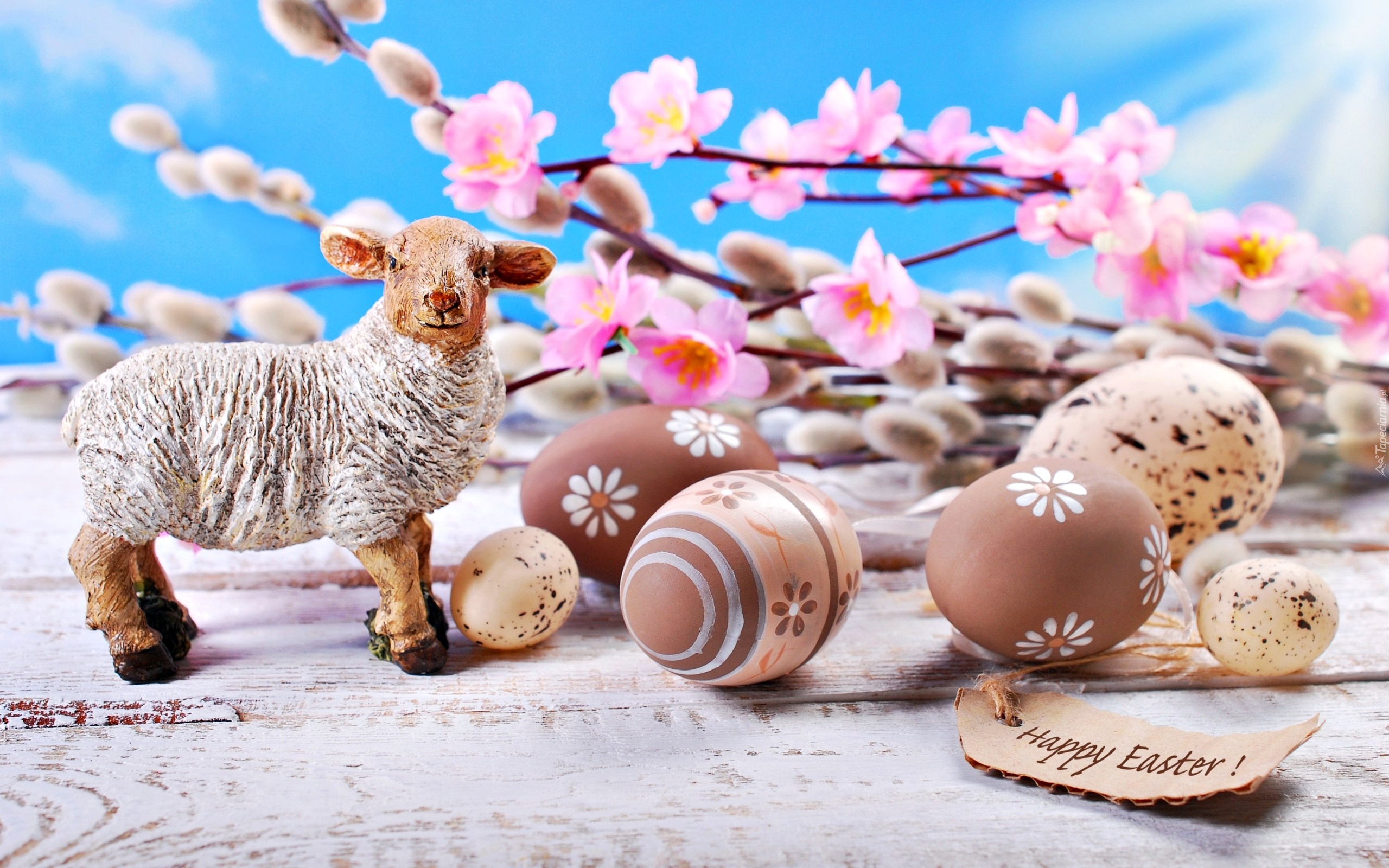 Edytor tapety: Wielkanocny baranek i pisanki z życzeniami