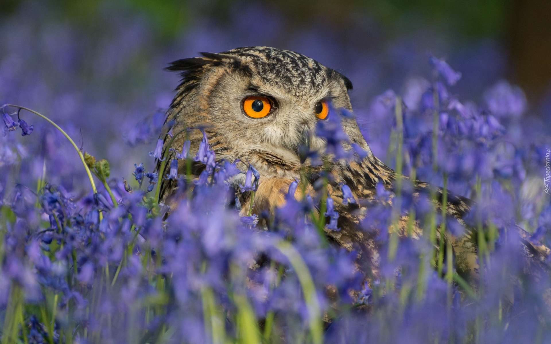 Edytor tapety: Sowa puchacz przyczajona w kwiatach