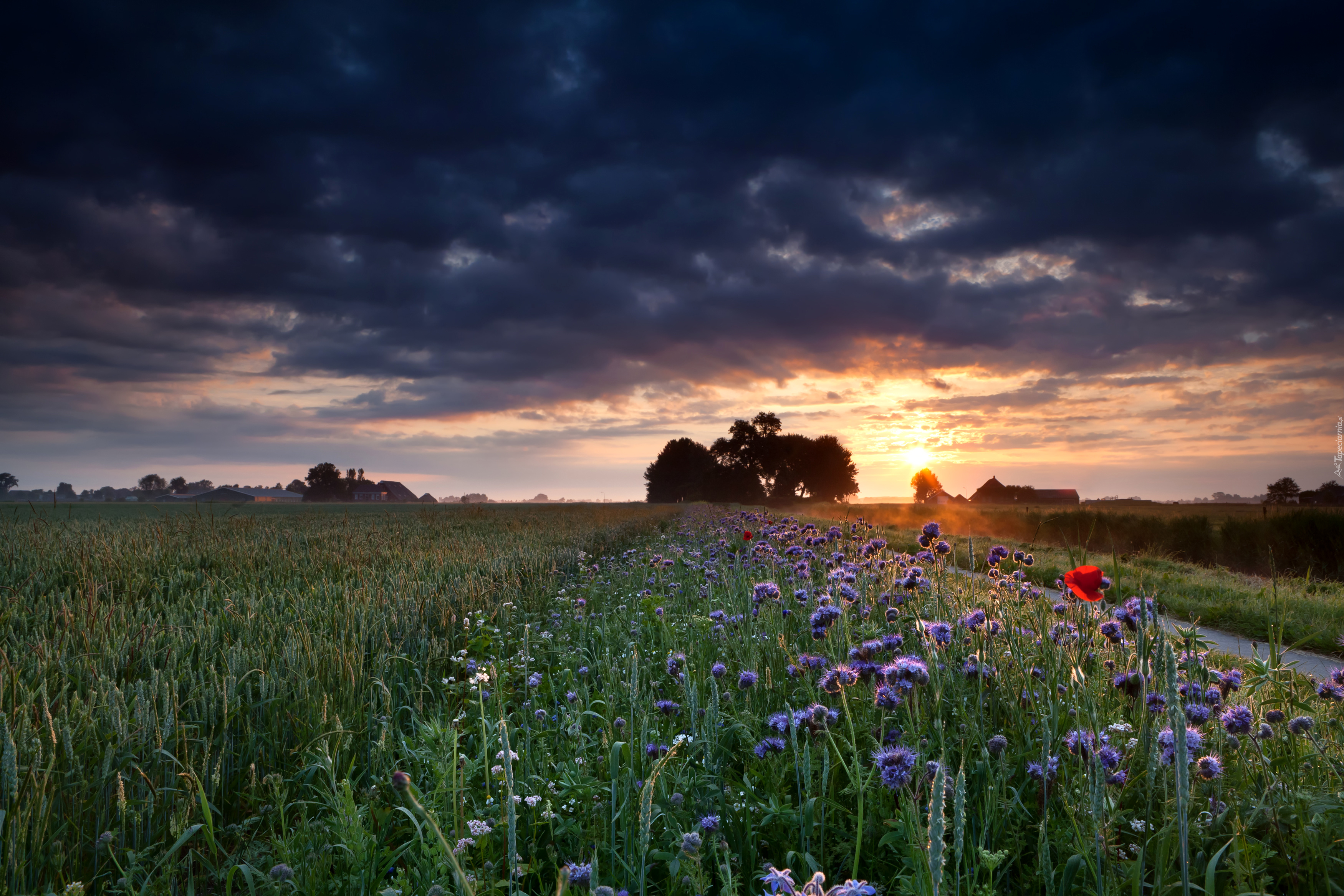 Edytor tapety: Słońce zachodzi nad ukwieconą łąką
