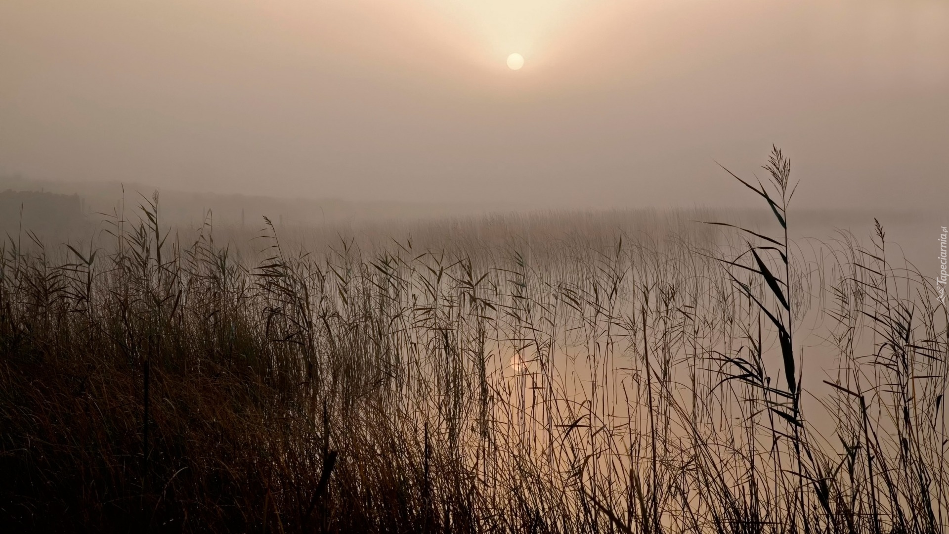 Edytor tapety: Trzciny nad zamglonym jeziorem