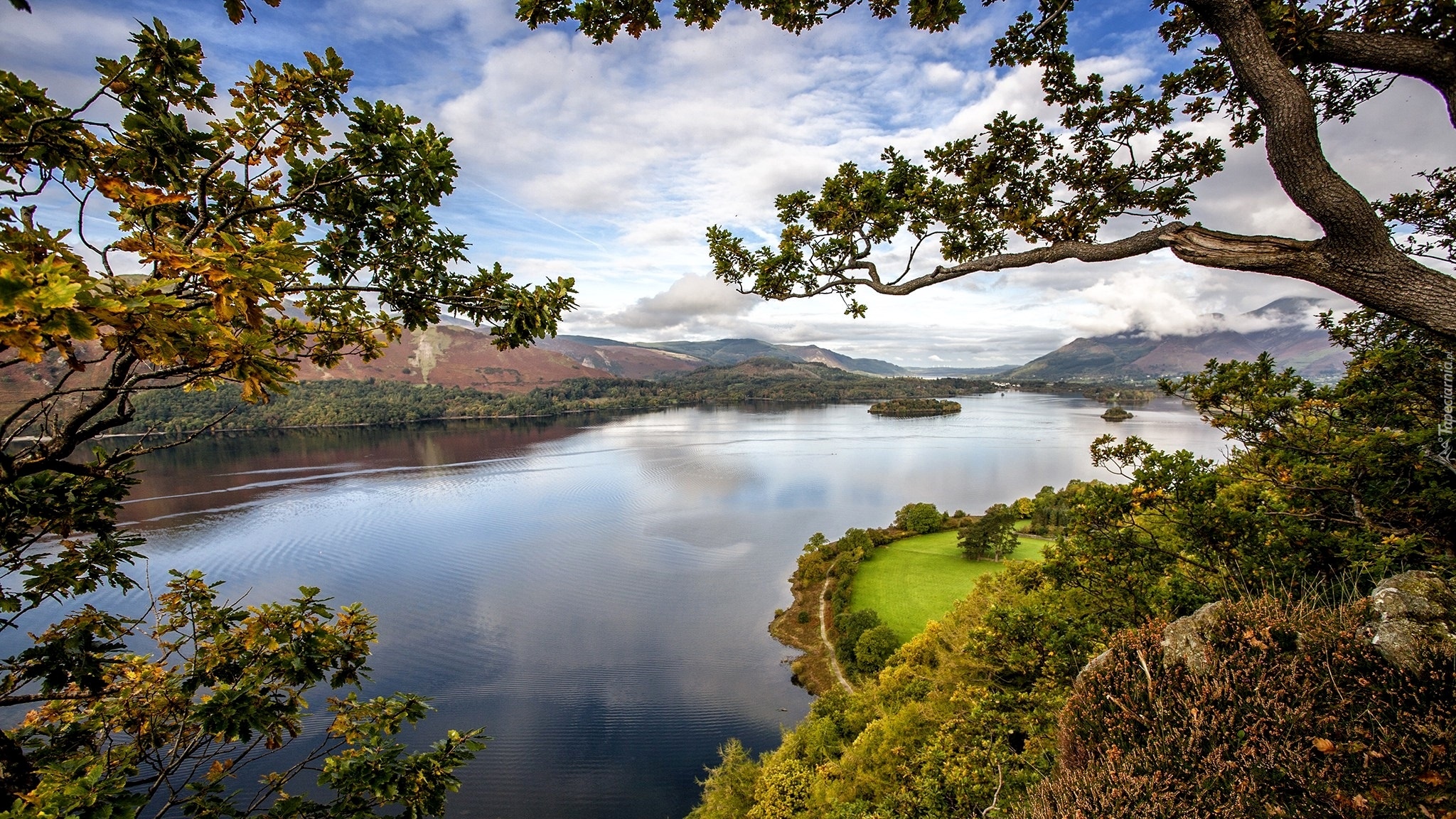 Edytor tapety: Drzewa nad jeziorem Derwentwater w Anglii