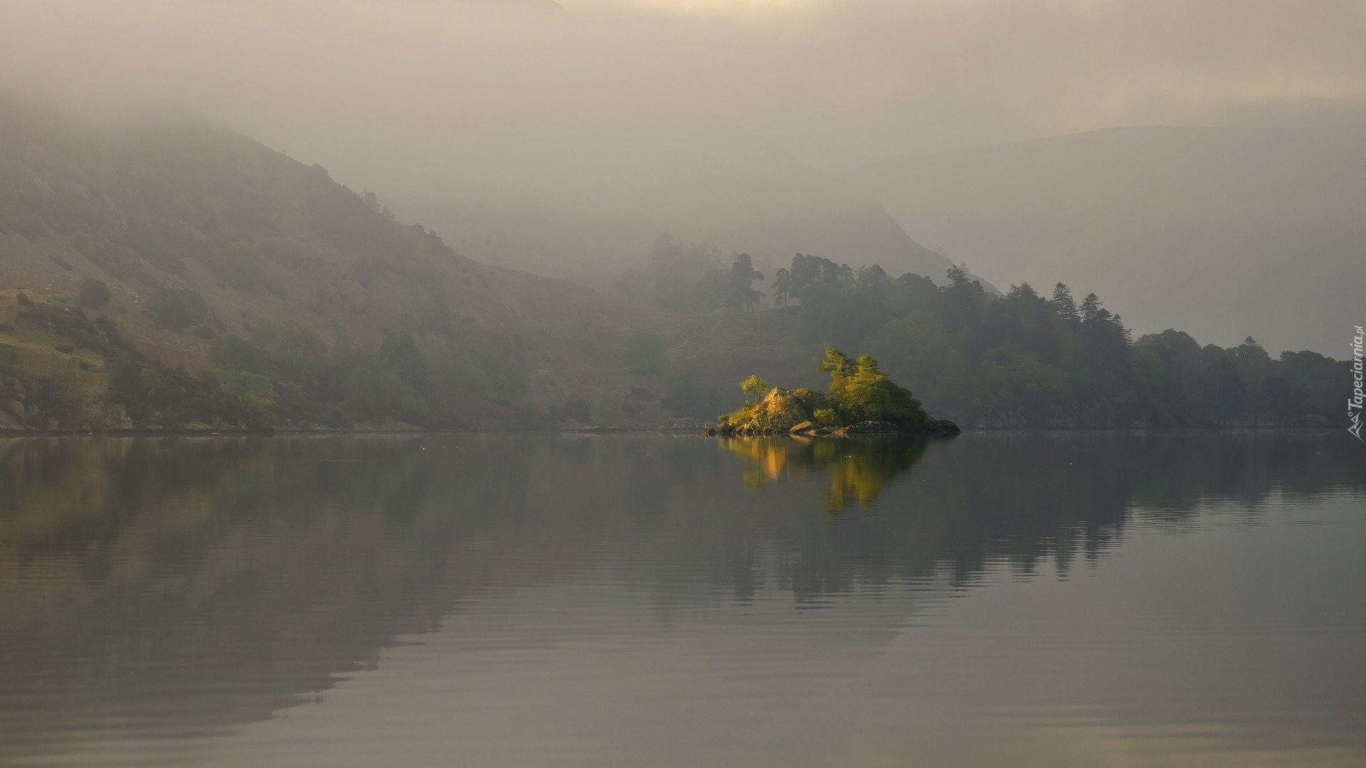 Edytor tapety: Wysepka na jeziorze z widokiem na zamglone góry