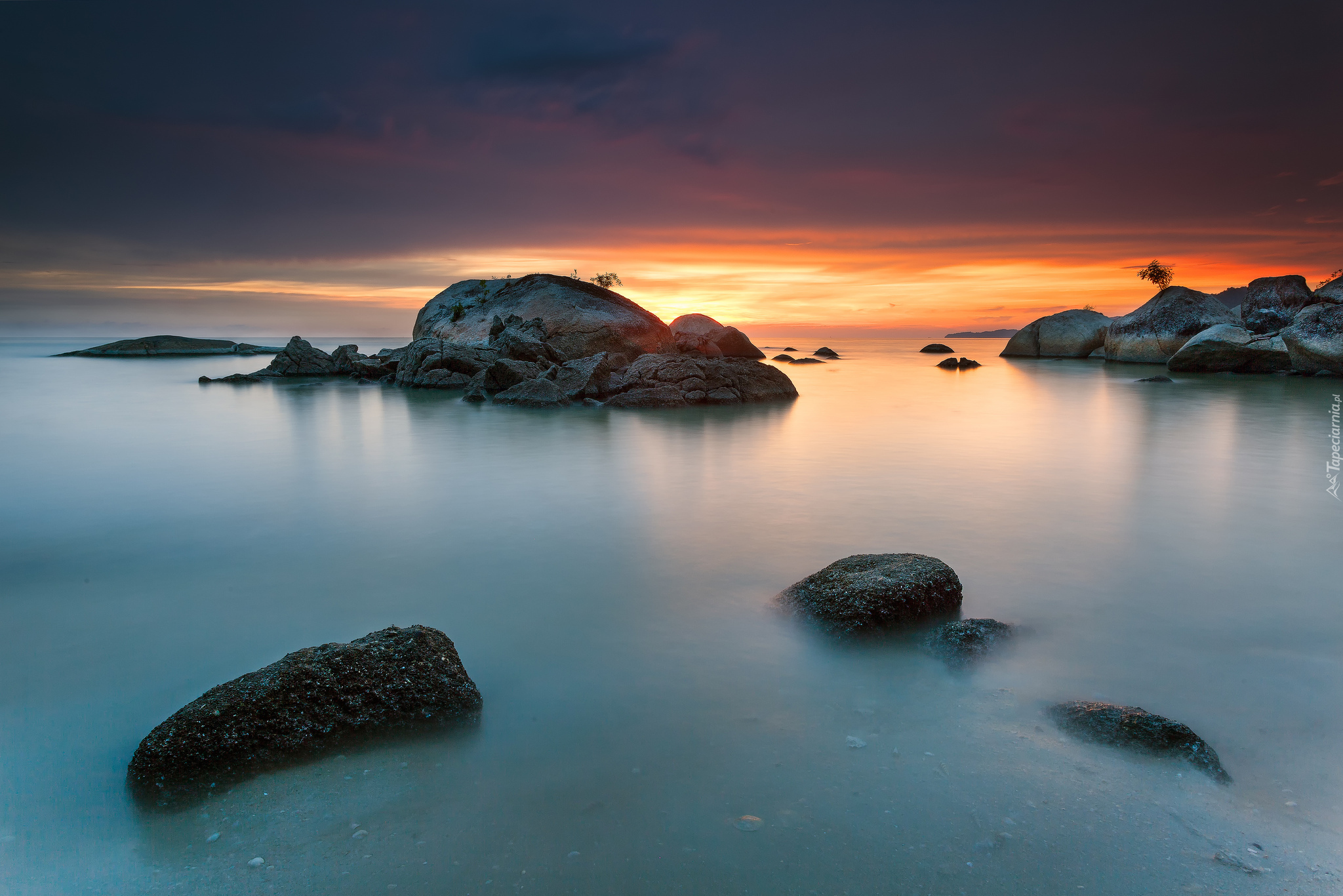 Edytor tapety: Skały na morzu o zachodzie słońca
