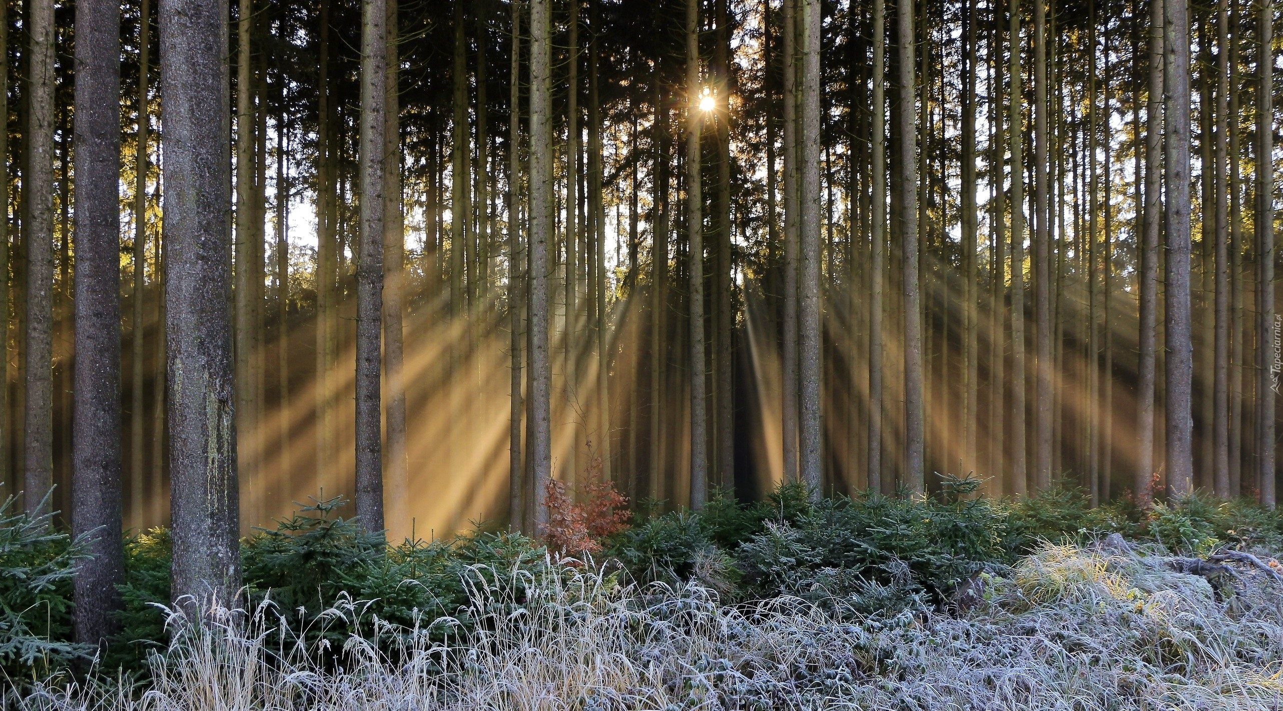 Edytor tapety: Promienie słońca muskają drzewa