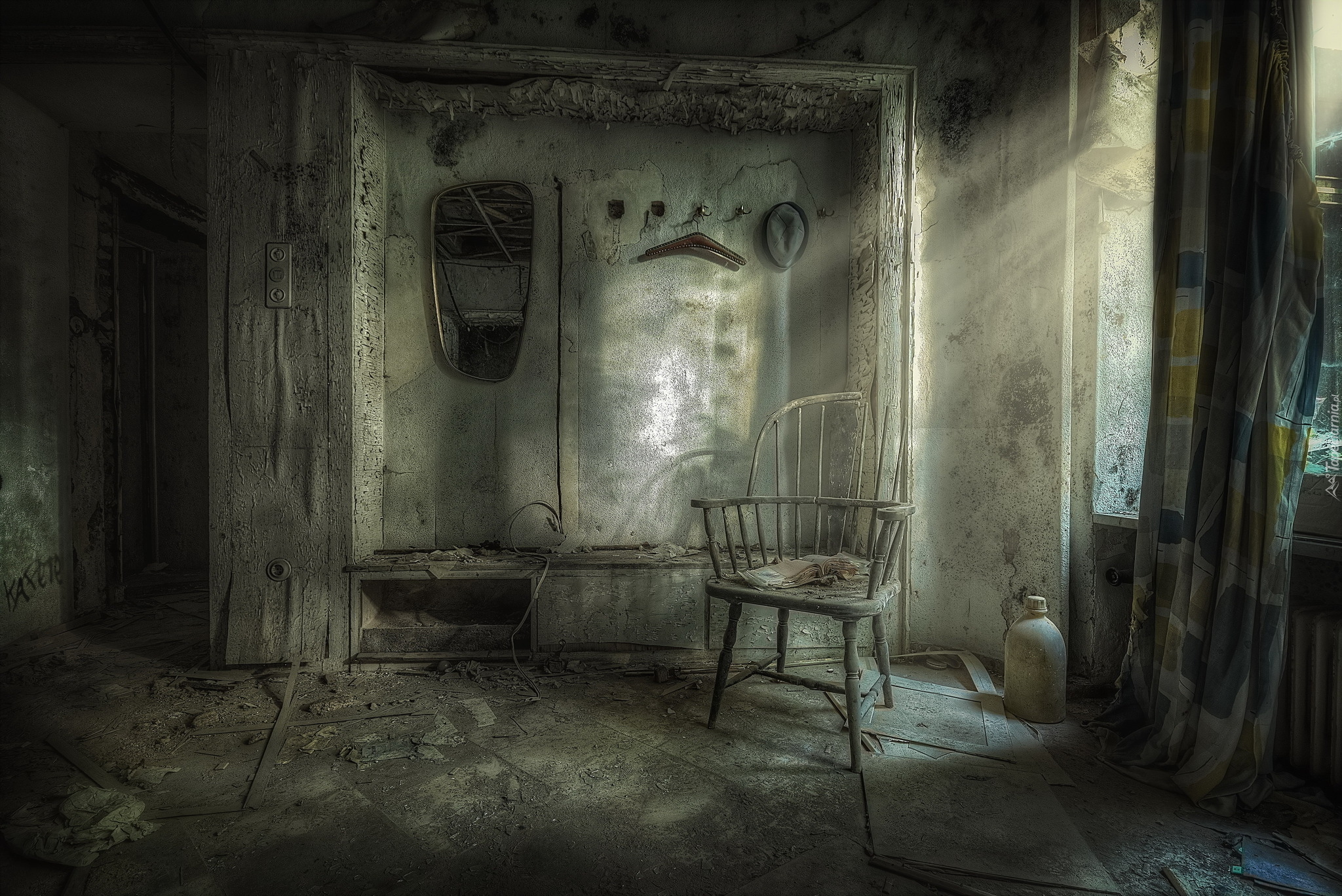 Edytor tapety: Krzesło w zrujnowanym pokoju do którego zagląda słońce