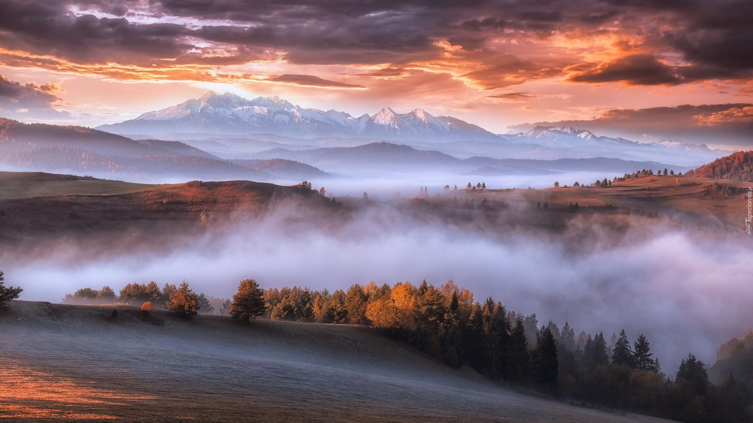 Edytor tapety: Wschód słońca nad zamglonymi Karpatami