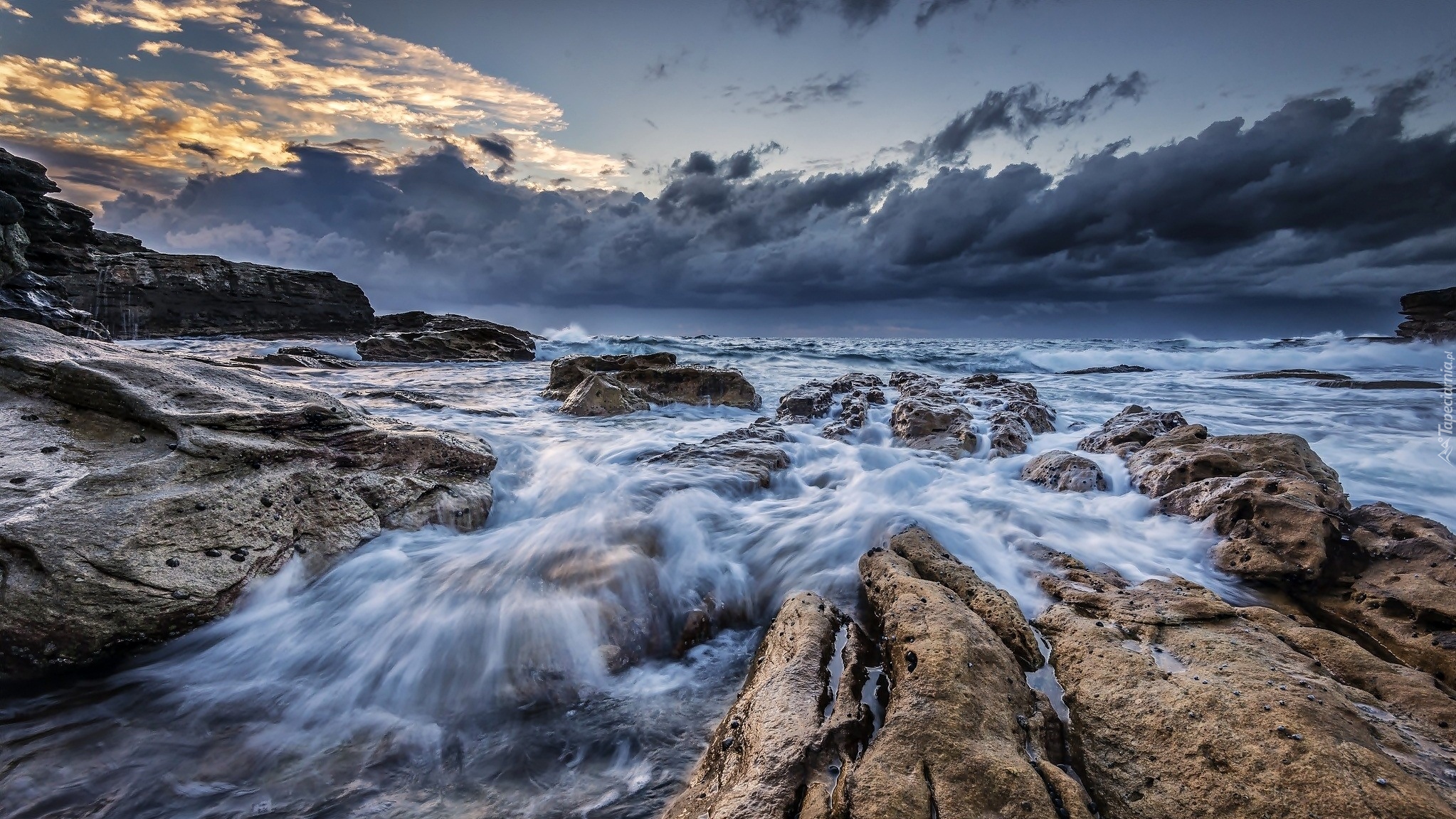 Edytor tapety: Zachmurzone niebo nad skalnym morskim wybrzeżem