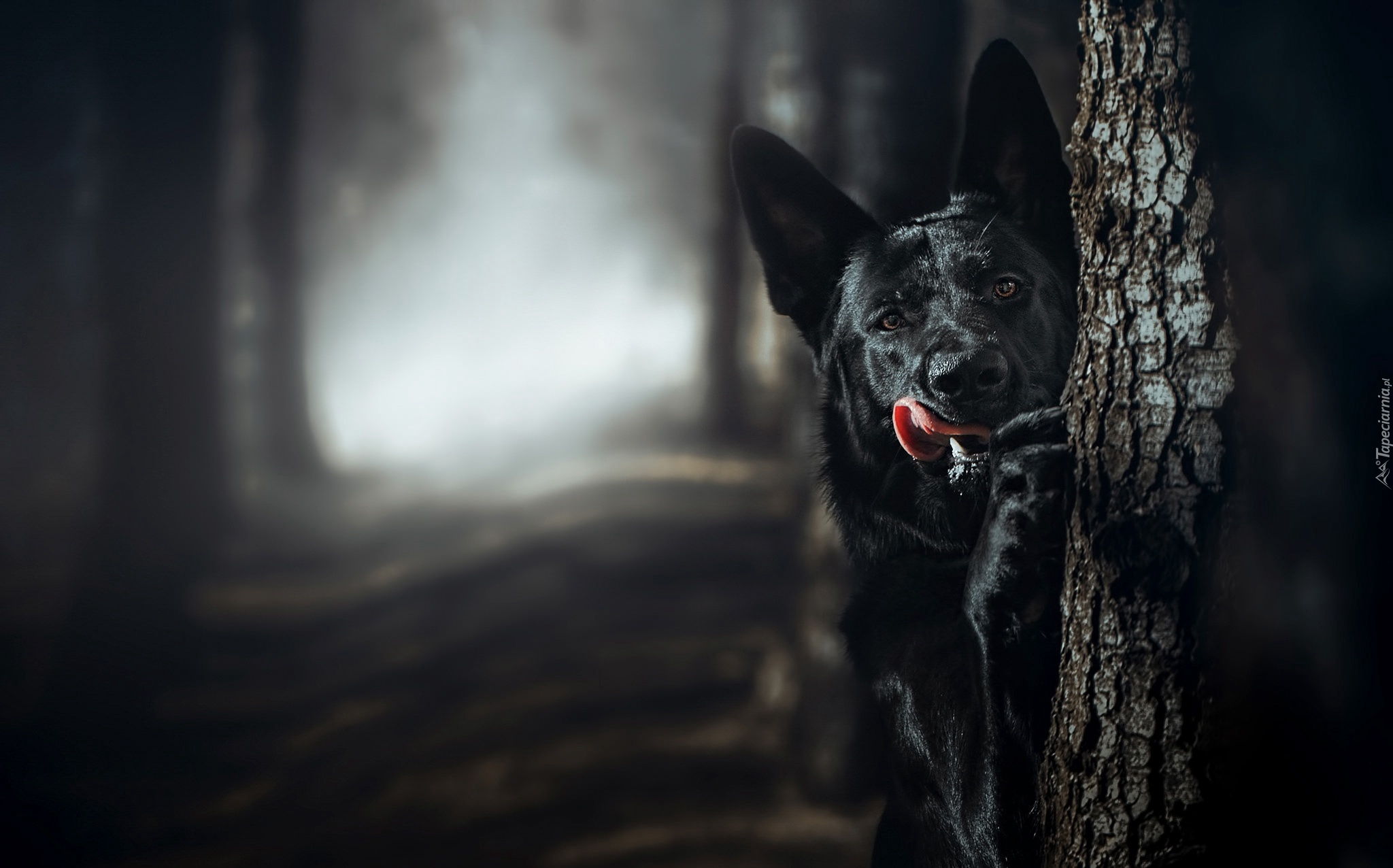 Edytor tapety: Czarny owczarek niemiecki spogląda zza drzewa