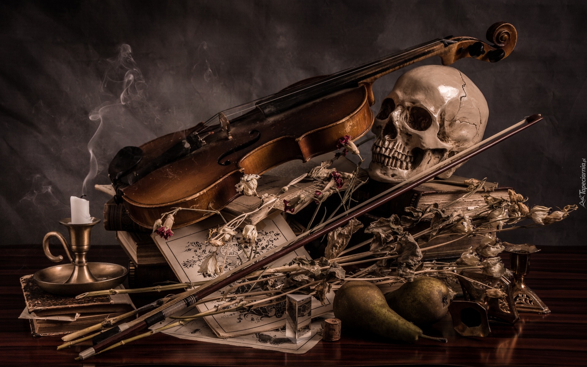 Edytor tapety: Czaszka i skrzypce obok dymiącej świecy