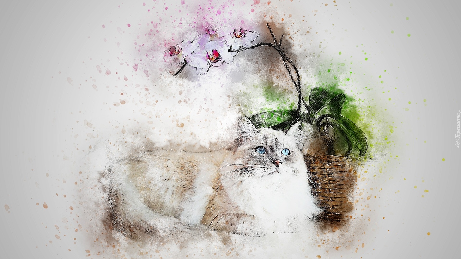 Edytor tapety: Niebieskooki kot leży obok kwiatów orchidei w koszyku