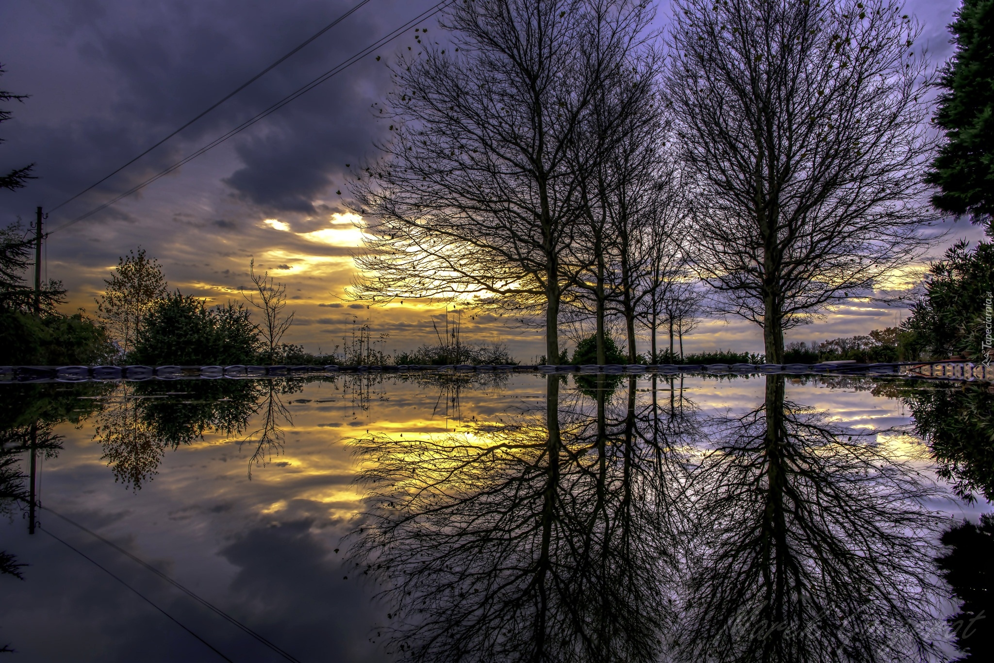 Edytor tapety: Odbicie drzew w lustrze wody o świcie