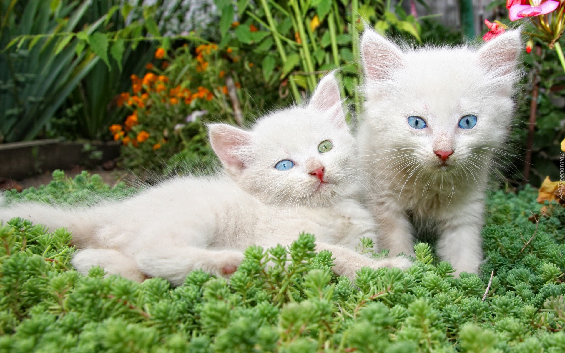 Edytor tapety: Dwa białe kotki wśród zielonych roślin i kwiatów