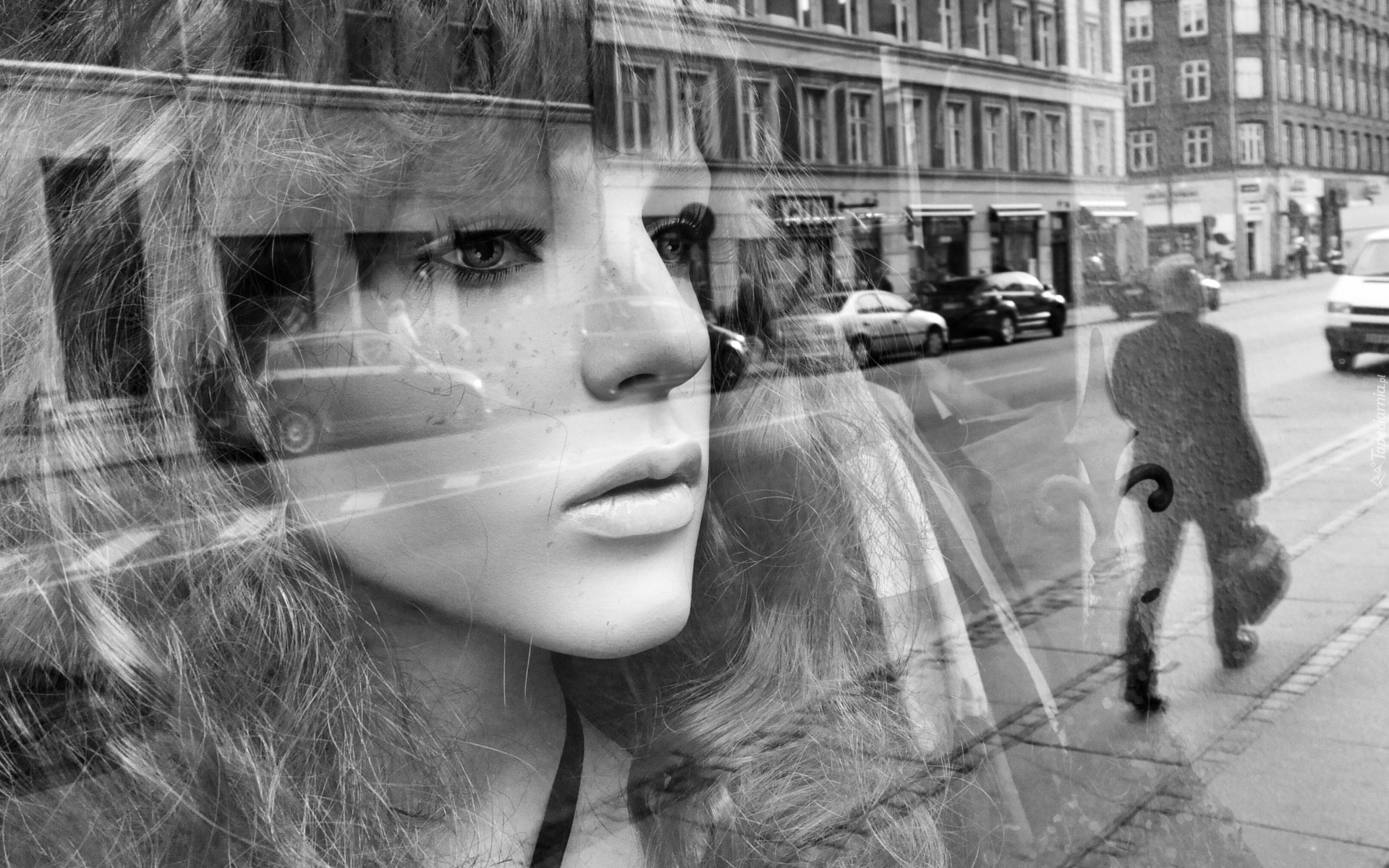 Edytor tapety: Czarno-białe zdjęcie twarzy kobiety na tle miasta