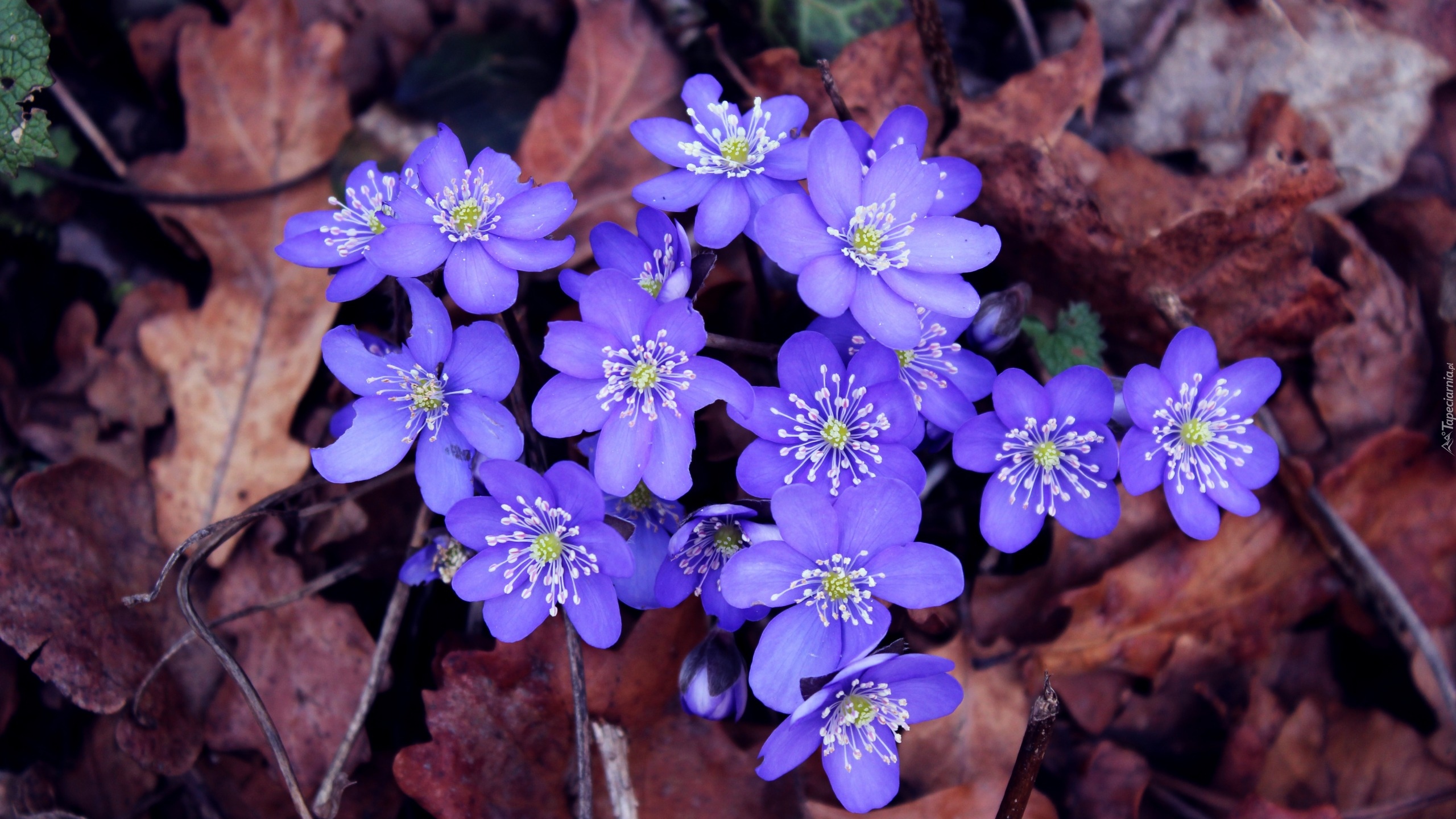 Edytor tapety: Niebieskie przylaszczki wyrosły w suchych liściach