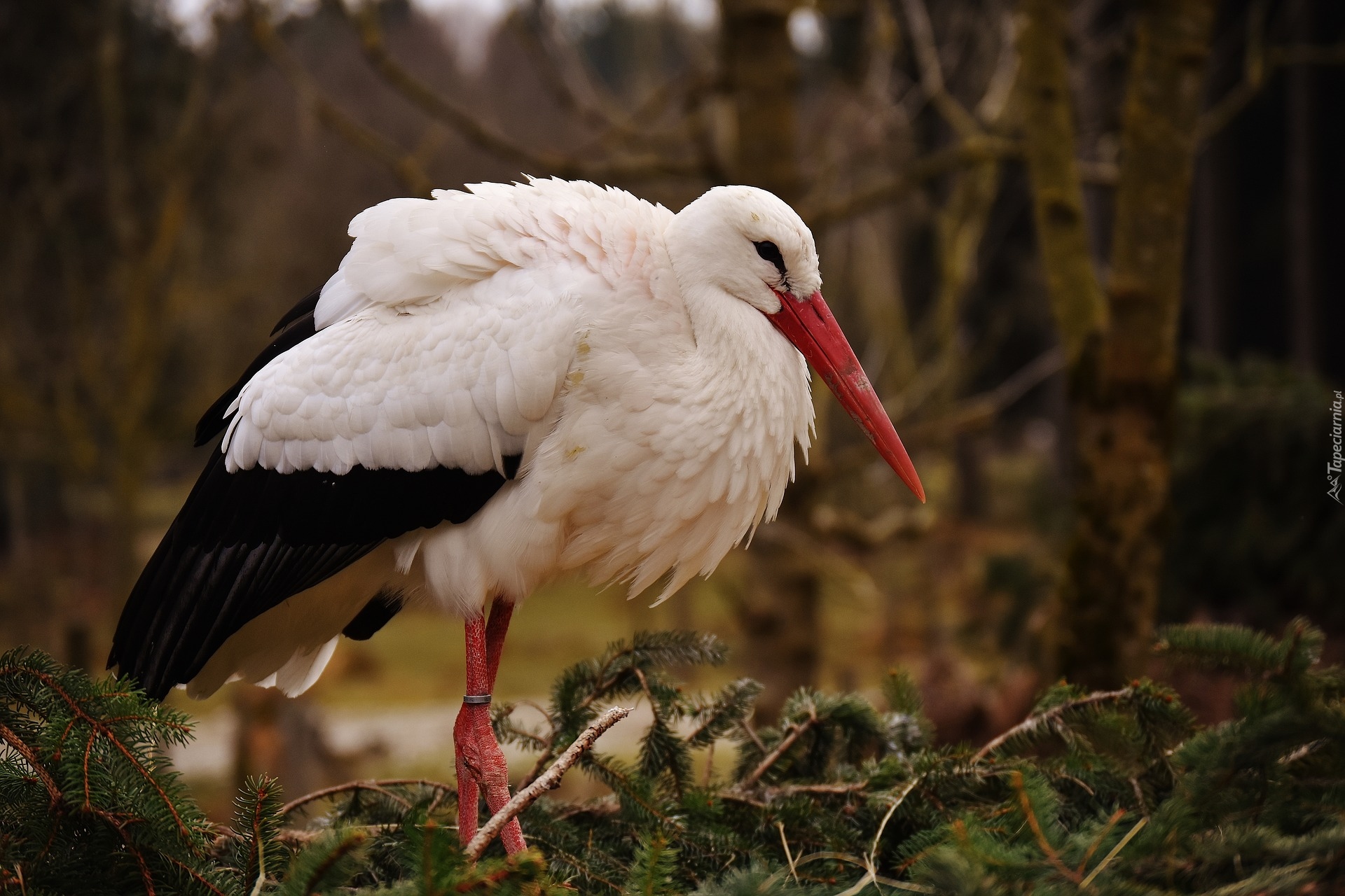 Edytor tapety: Bocian stoi na iglastych gałązkach