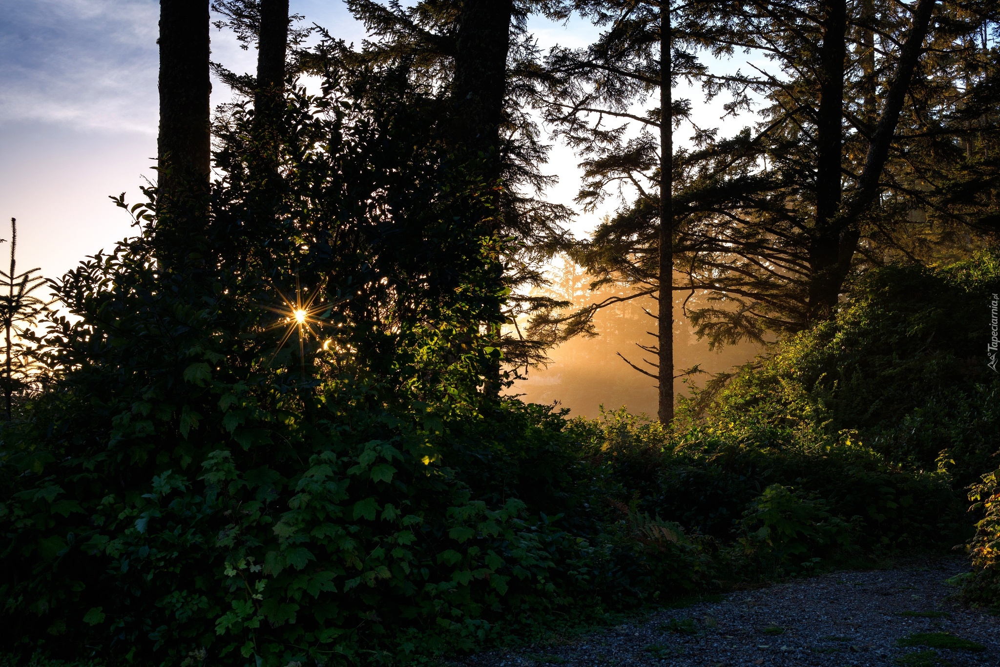 Edytor tapety: Promienie słońca między drzewami w lesie