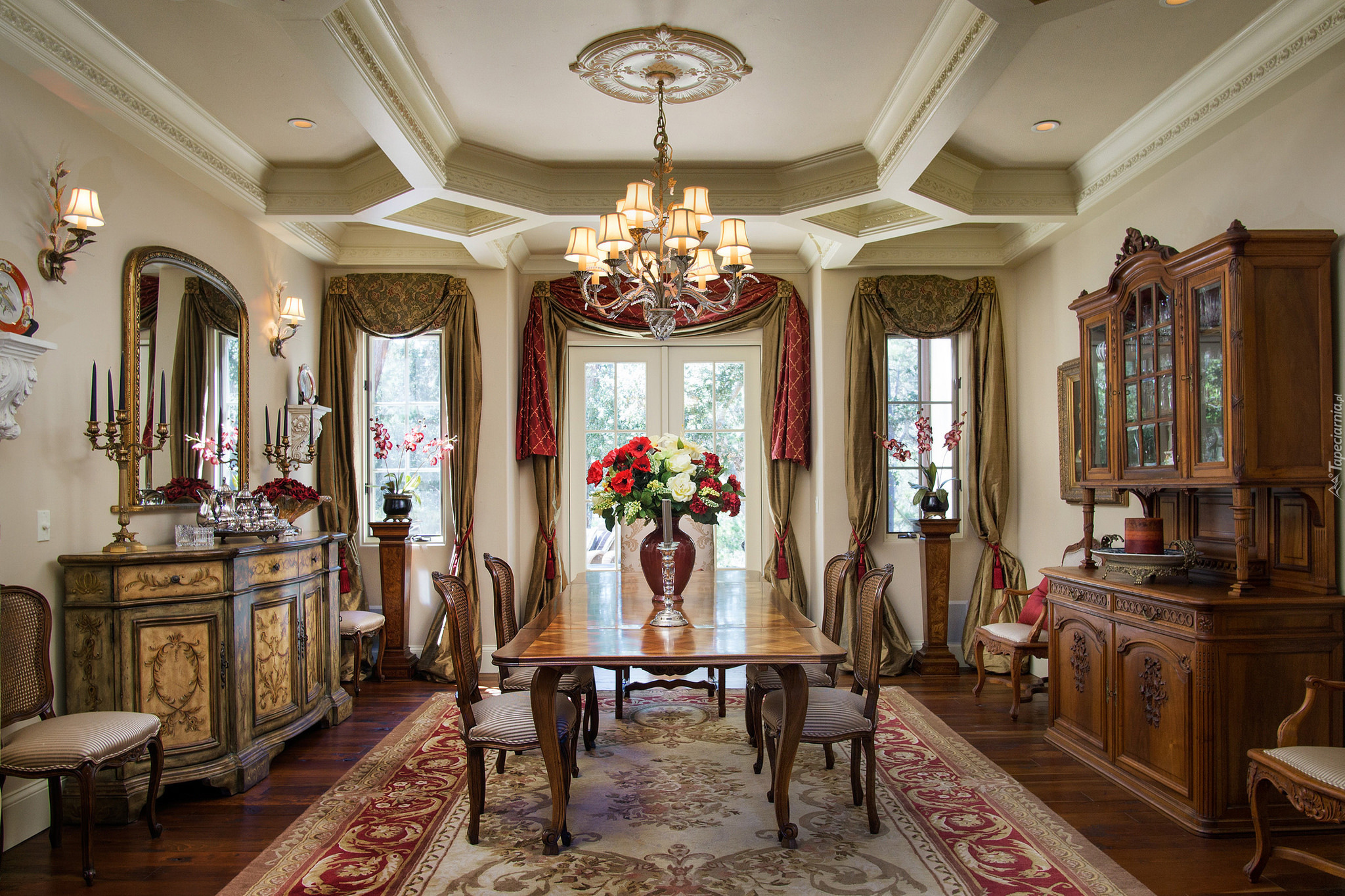 Edytor tapety: Wnętrze umeblowanej jadalni z bukietem kwiatów na stole