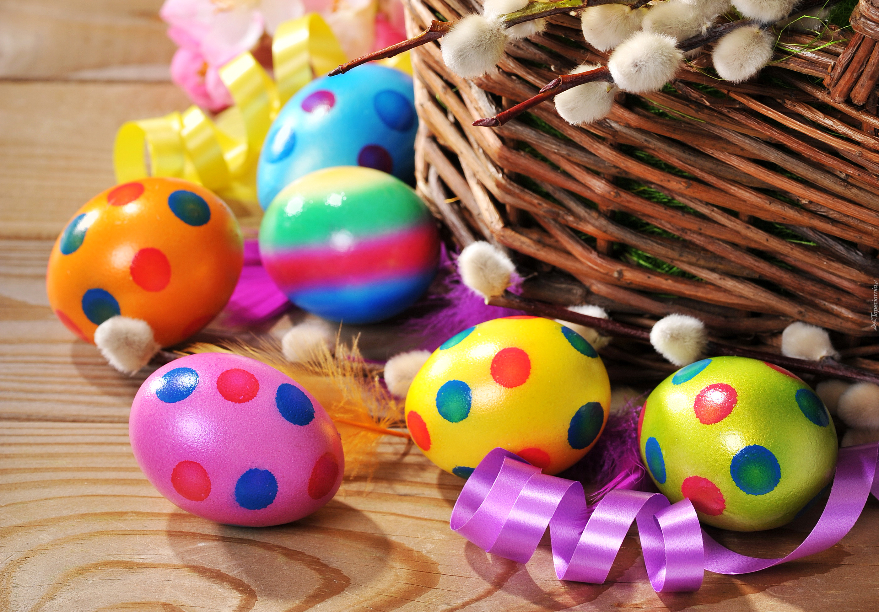 Edytor tapety: Kolorowe pisanki przy koszyku z baziami