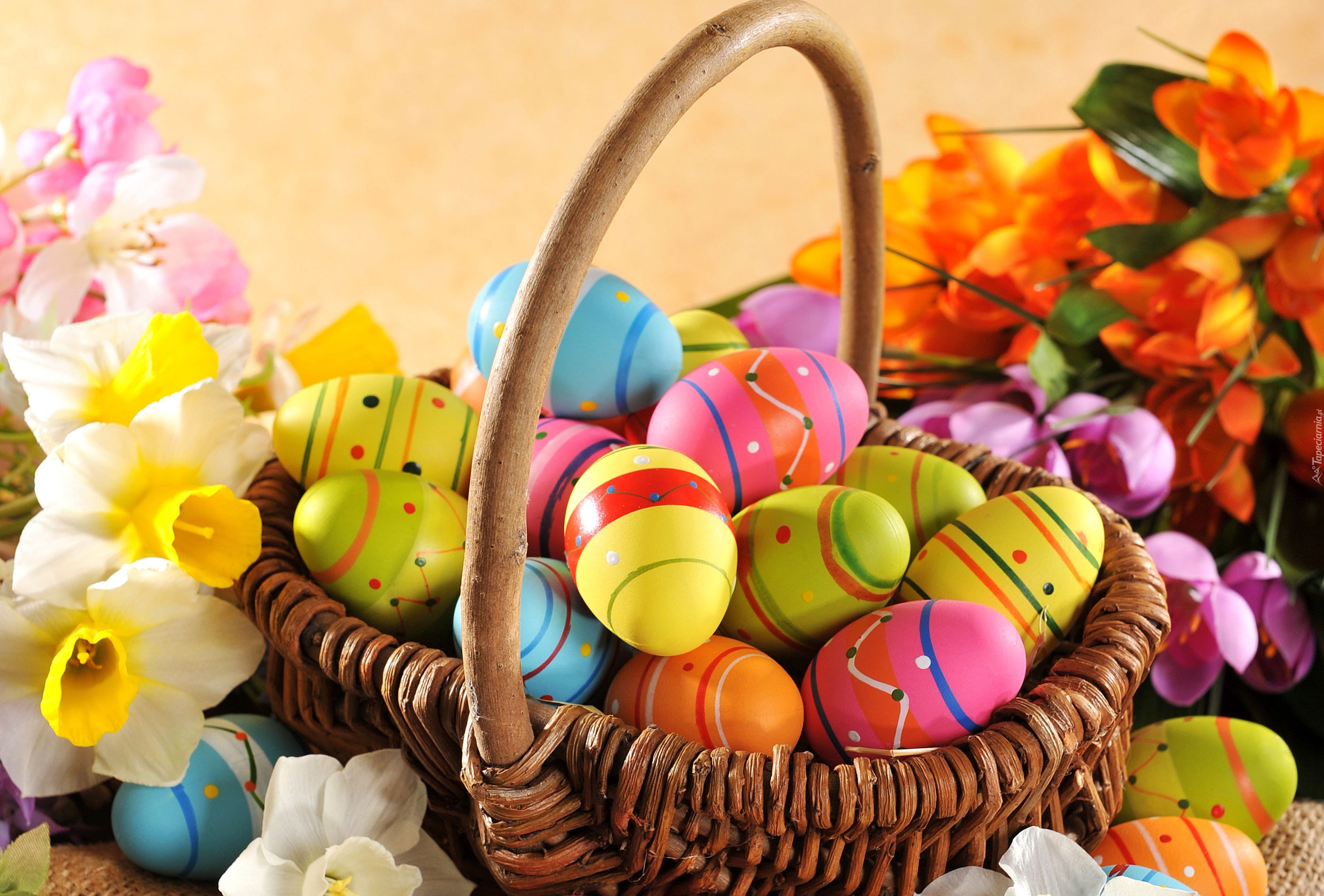 Edytor tapety: Kolorowe wielkanocne pisanki w koszyku między bukietami kwiatów