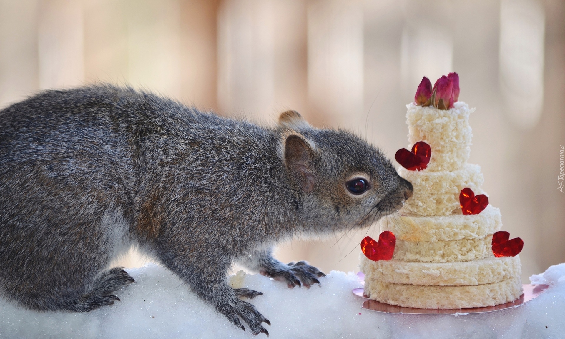 Edytor tapety: Wiewiórka zainteresowana tortem z serduszkami
