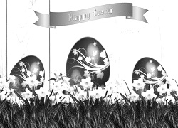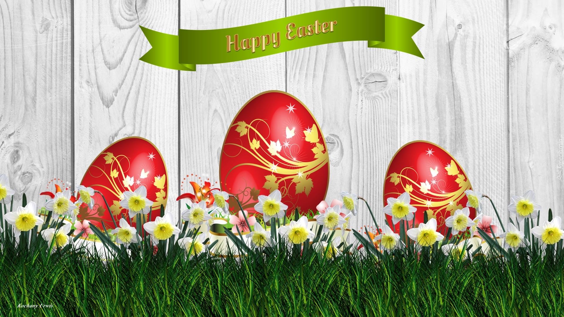 Edytor tapety: Świąteczne życzenia z pisankami i żonkilami w trawie