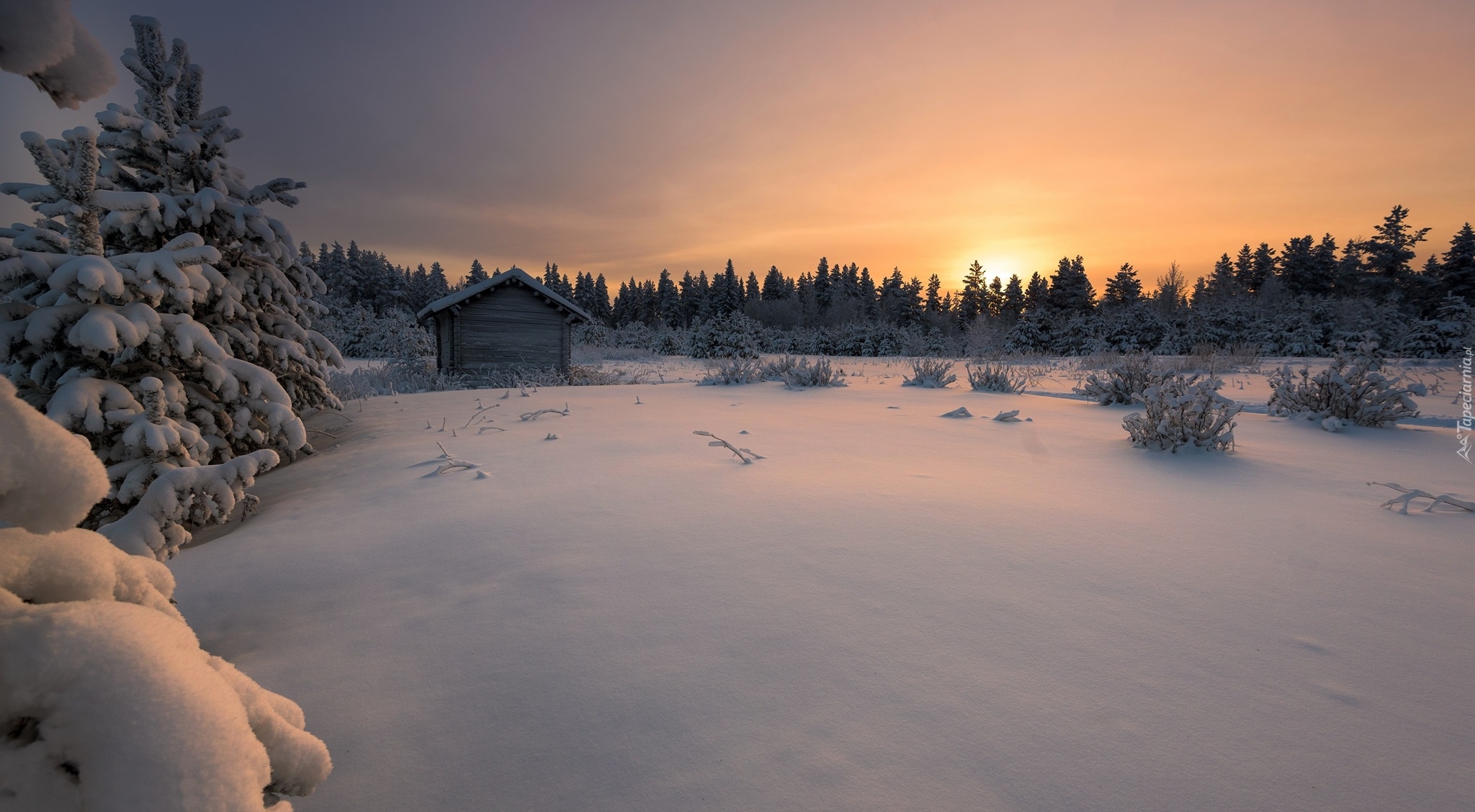 Edytor tapety: Szopa w zaśnieżonym lesie świerkowym o wschodzie słońca