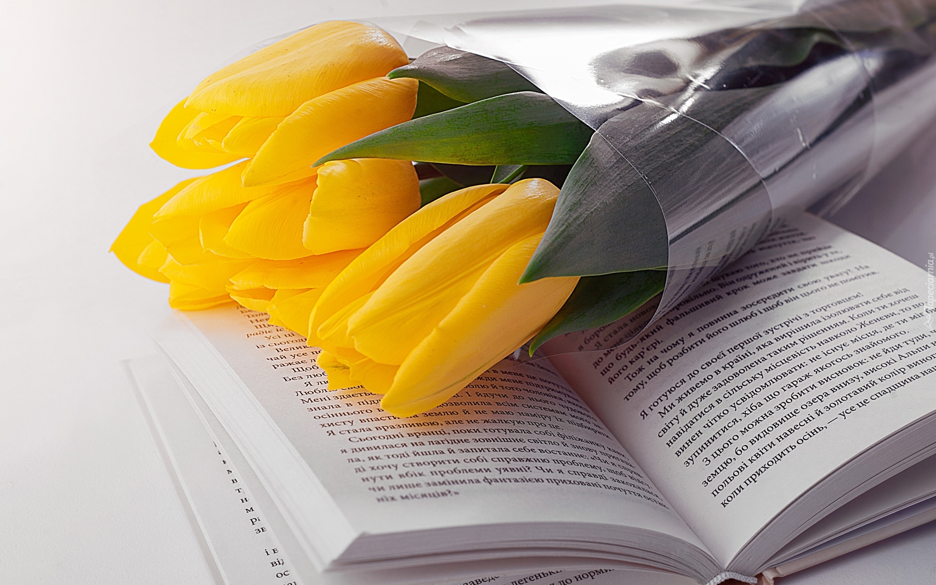 Edytor tapety: Wiązanka żółtych tulipanów na książce