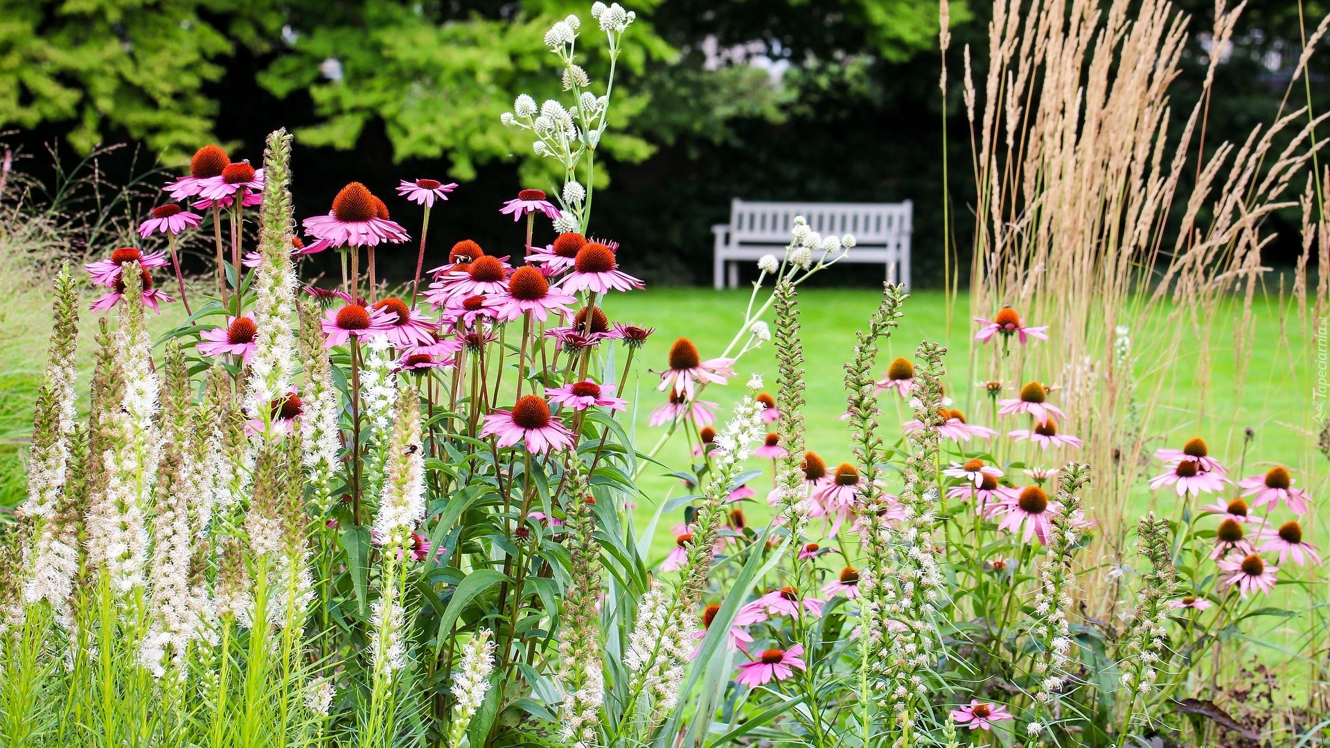 Edytor tapety: Wiosenny ukwiecony park z ławeczką i kwiatami jeżówki