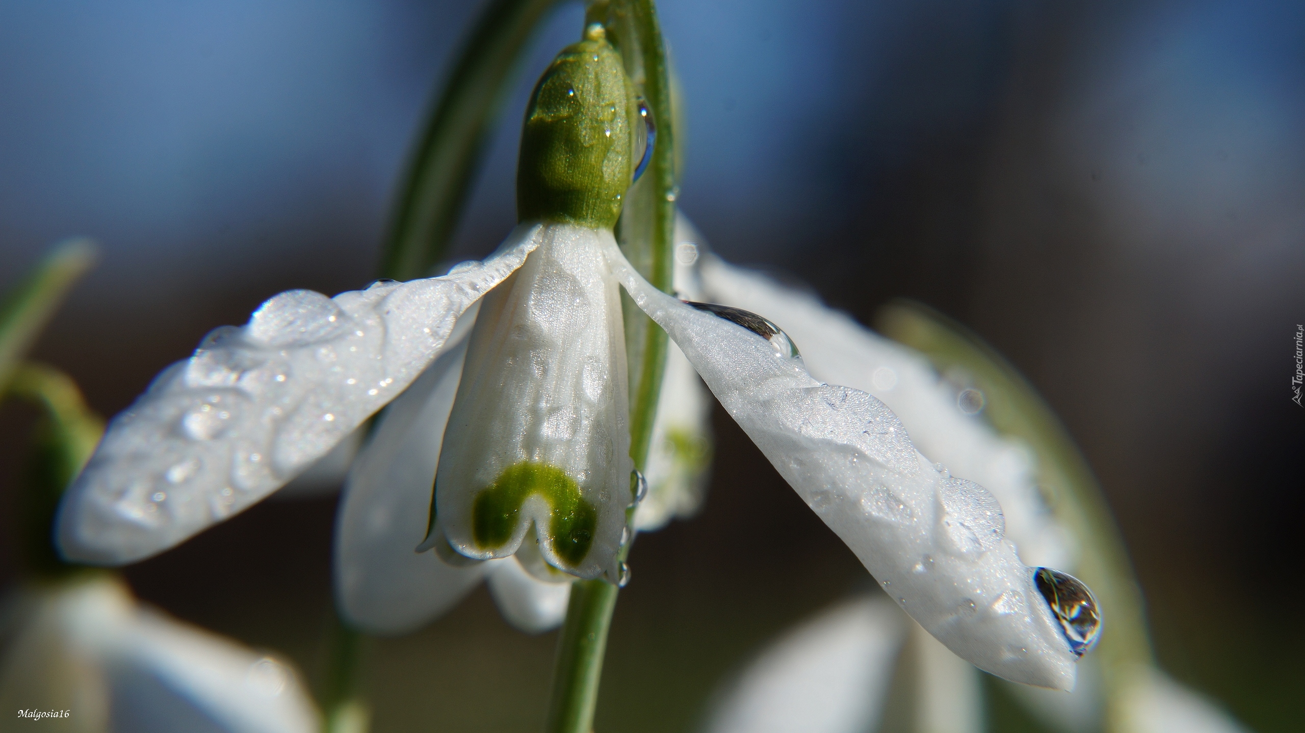 Edytor tapety: Biały rozwinięty przebiśnieg w kroplach wody