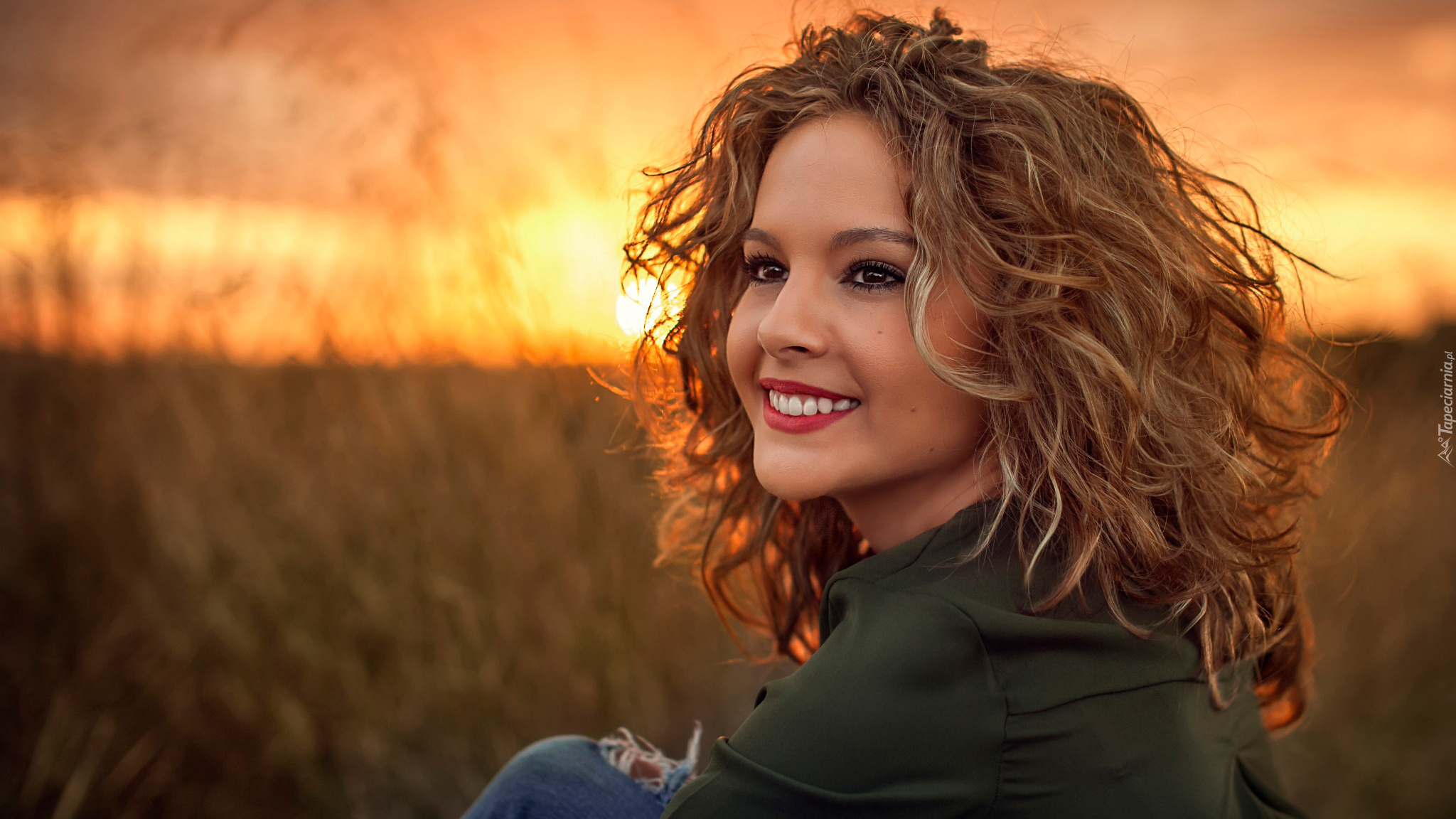 Edytor tapety: Uśmiechnięta kobieta w blasku zachodzącego słońca