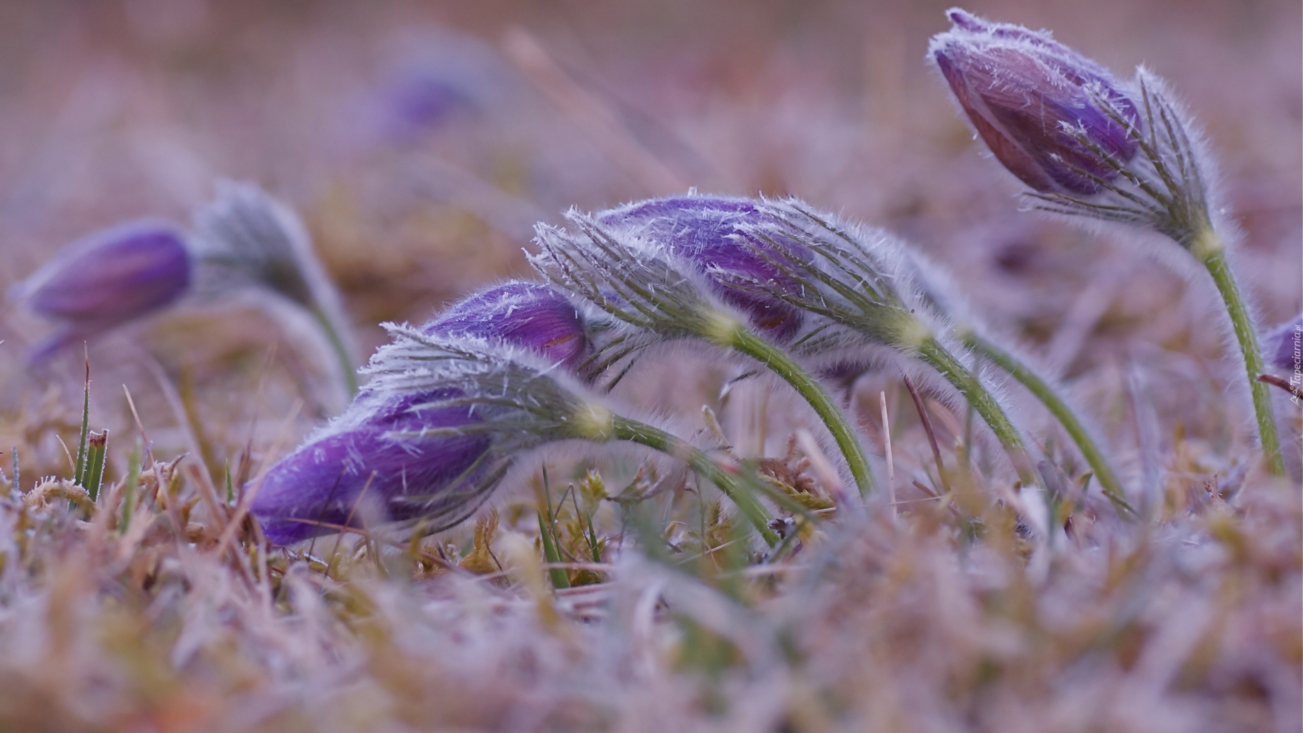 Edytor tapety: Pochylone kwiaty sasanki w trawie