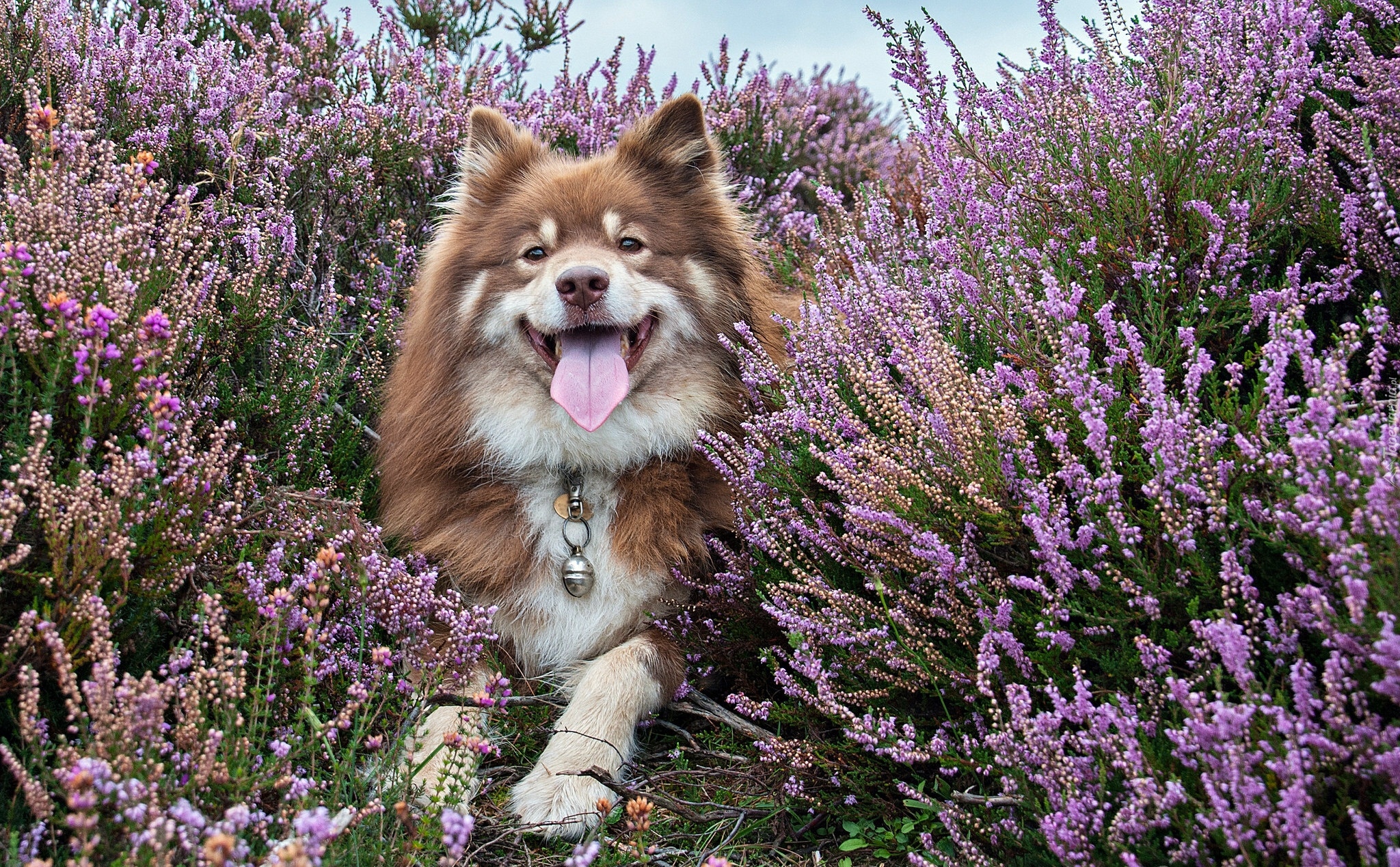Edytor tapety: Radosny fiński lapphund we wrzosach