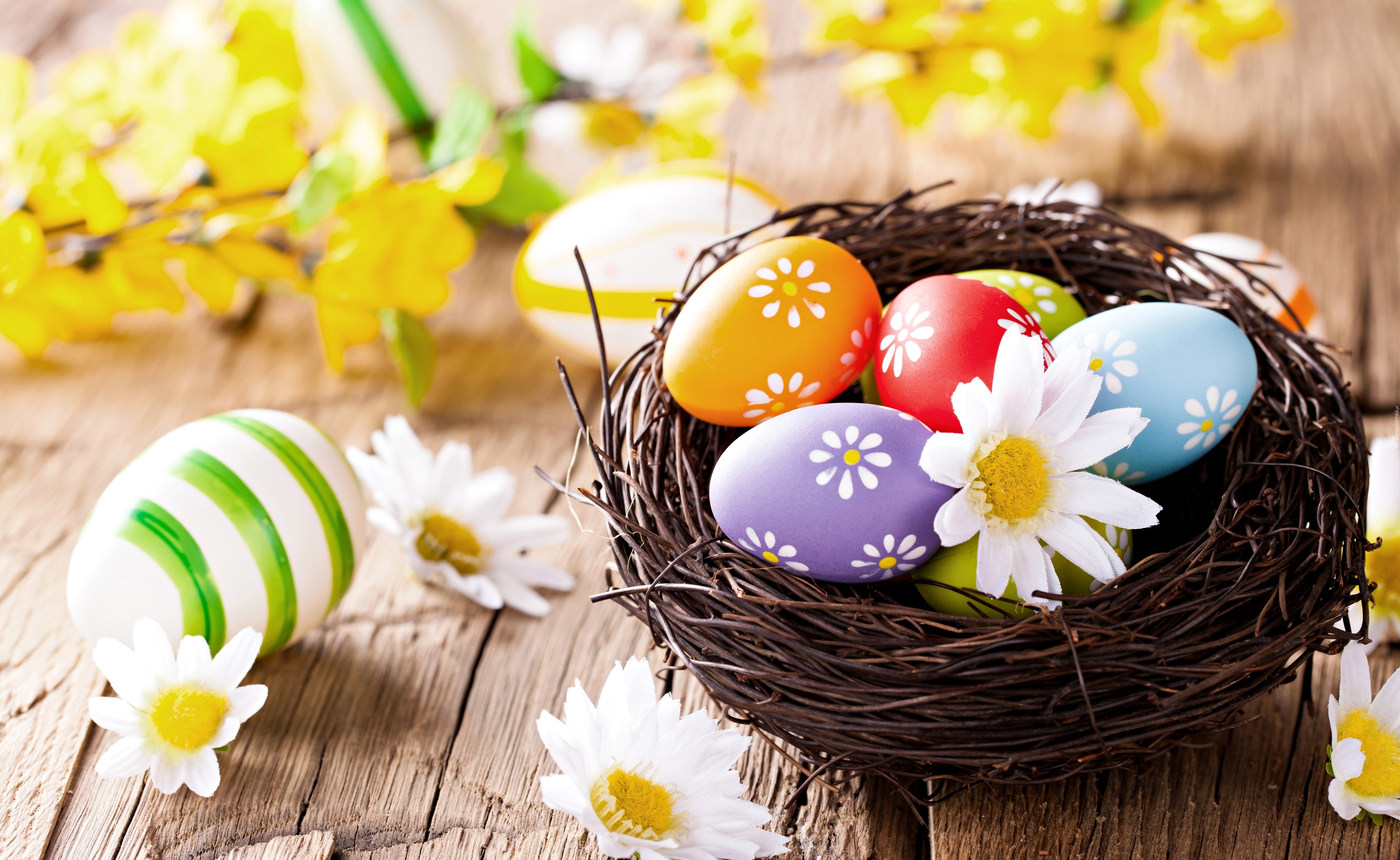 Edytor tapety: Wielkanocna dekoracja z pisankami w gnieździe i kwiatami