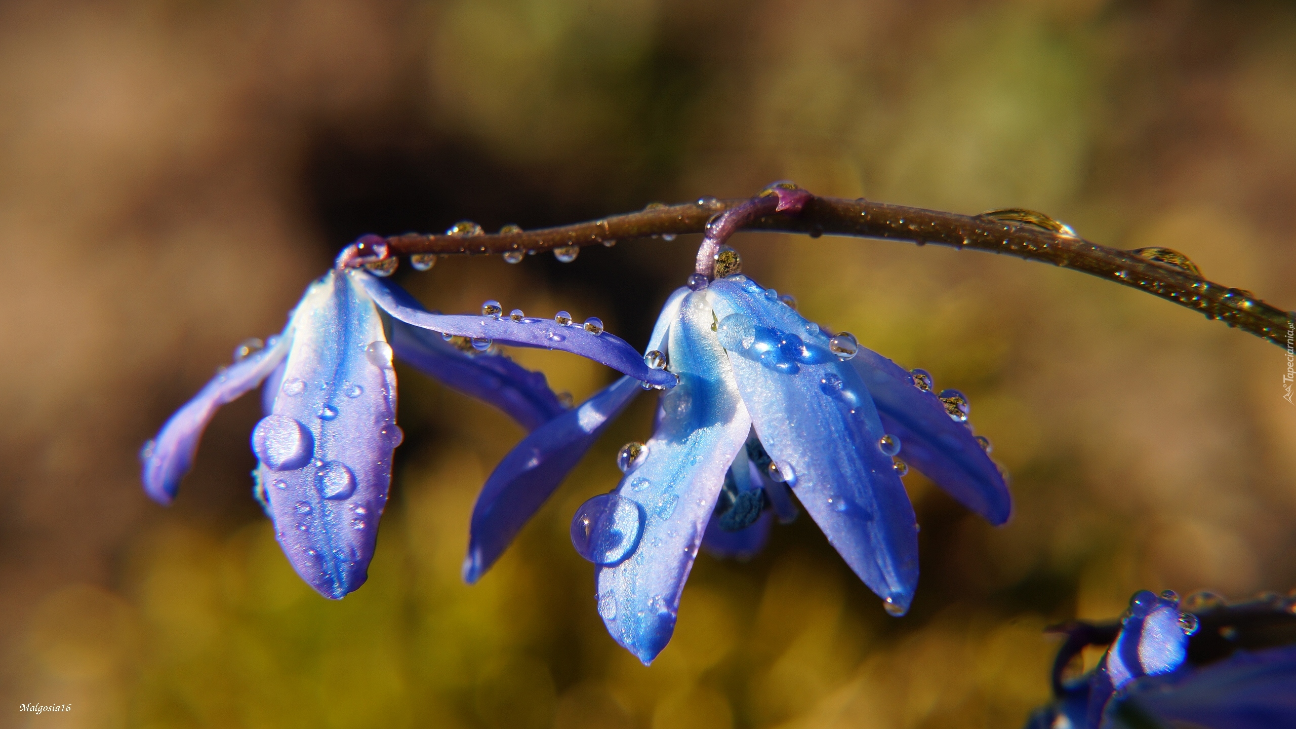 Edytor tapety: Krople wody na niebieskich kwiatach cebulicy syberyjskiej