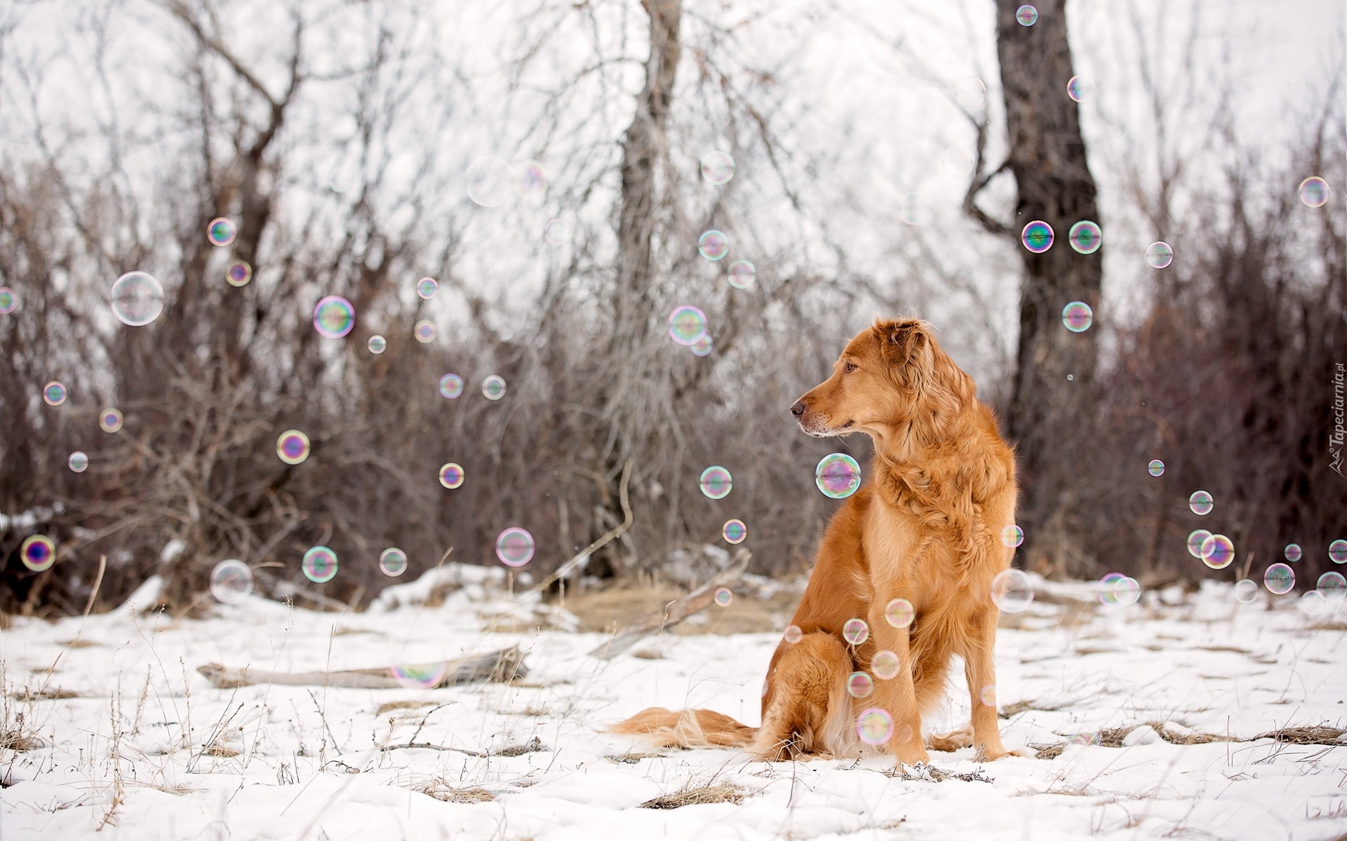 Edytor tapety: Pies na śniegu obserwuje bańki mydlane
