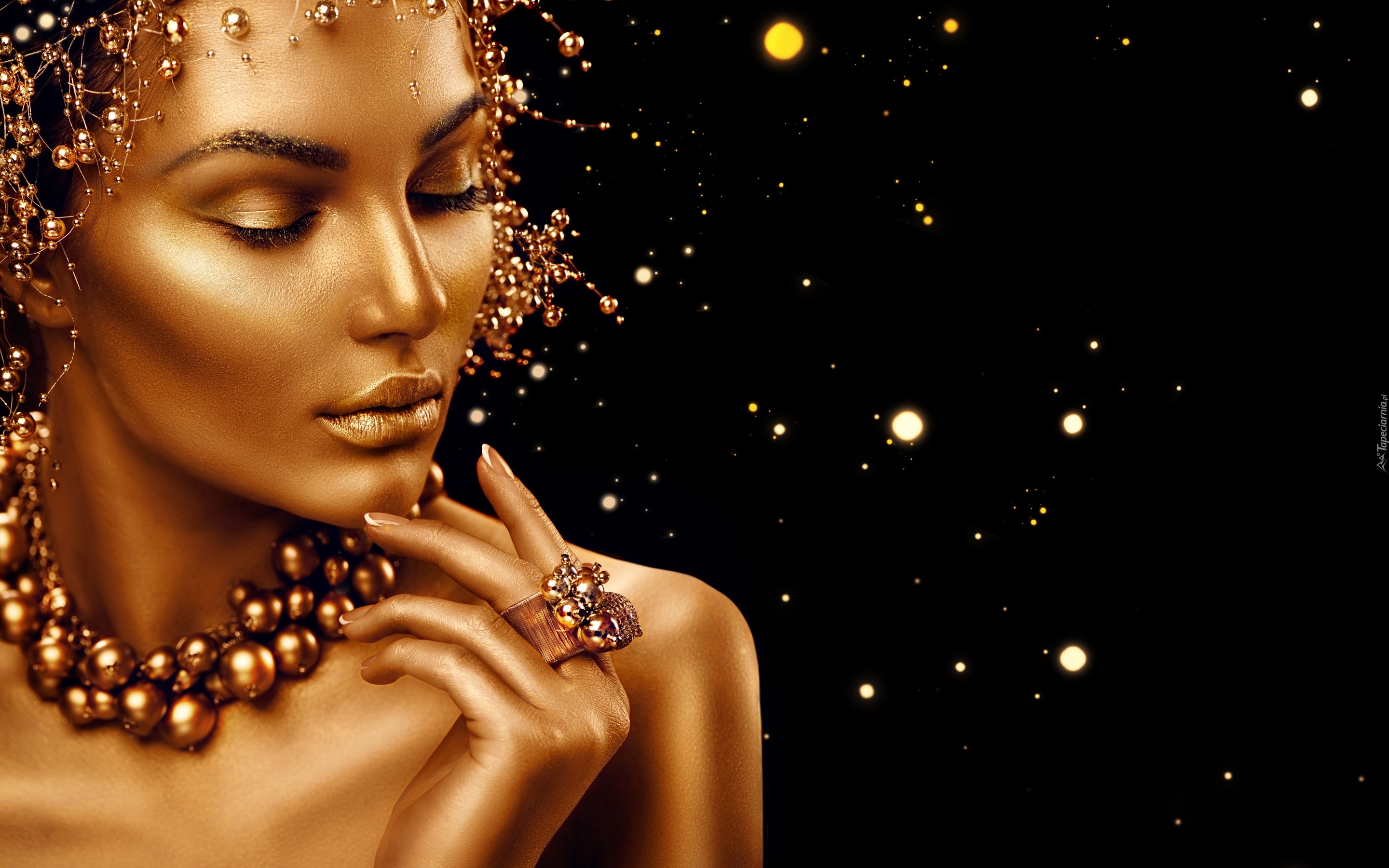Edytor tapety: Kobieta pomalowana na złoto w złotej biżuterii