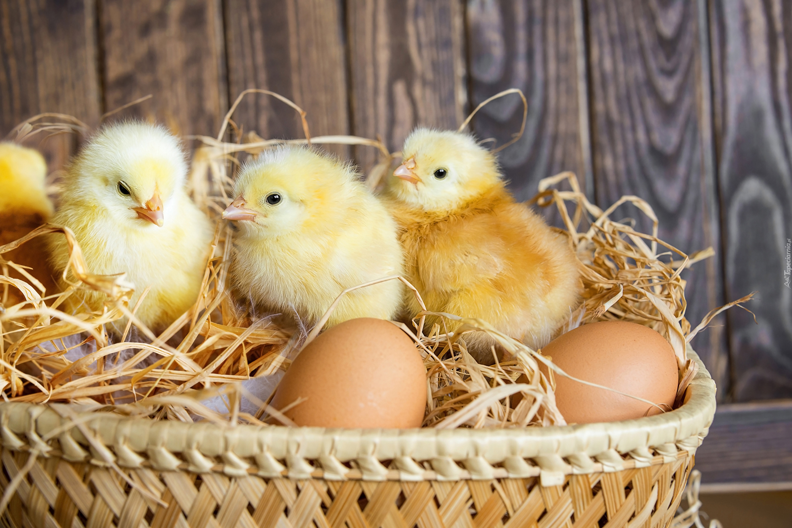 Edytor tapety: Jajka i małe kurczaczki w koszyczku